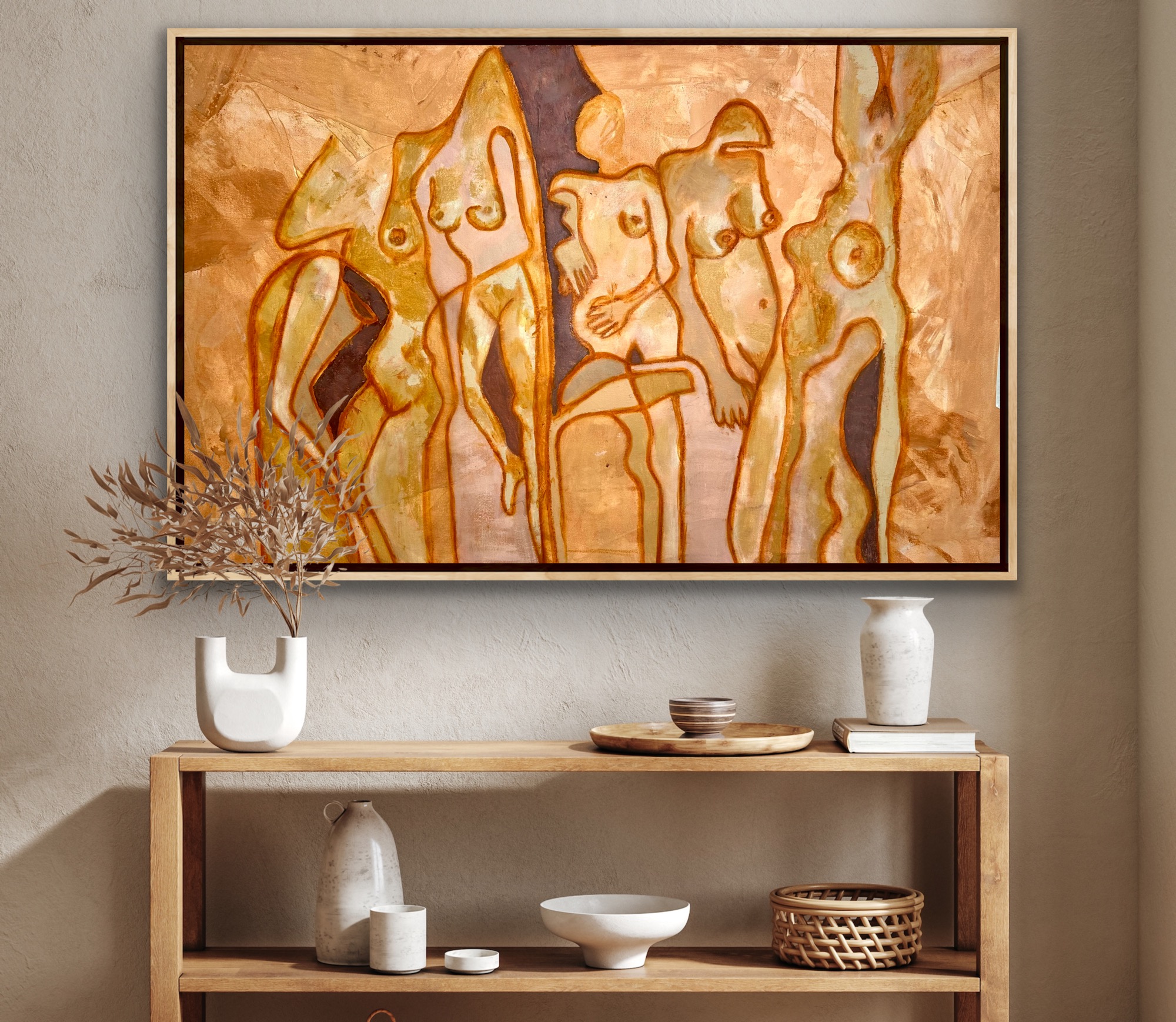 The earthy palette of muted browns, warm ochres, and subtle flesh tones create a grounding atmosphere, evoking a sense of connection to the natural world.