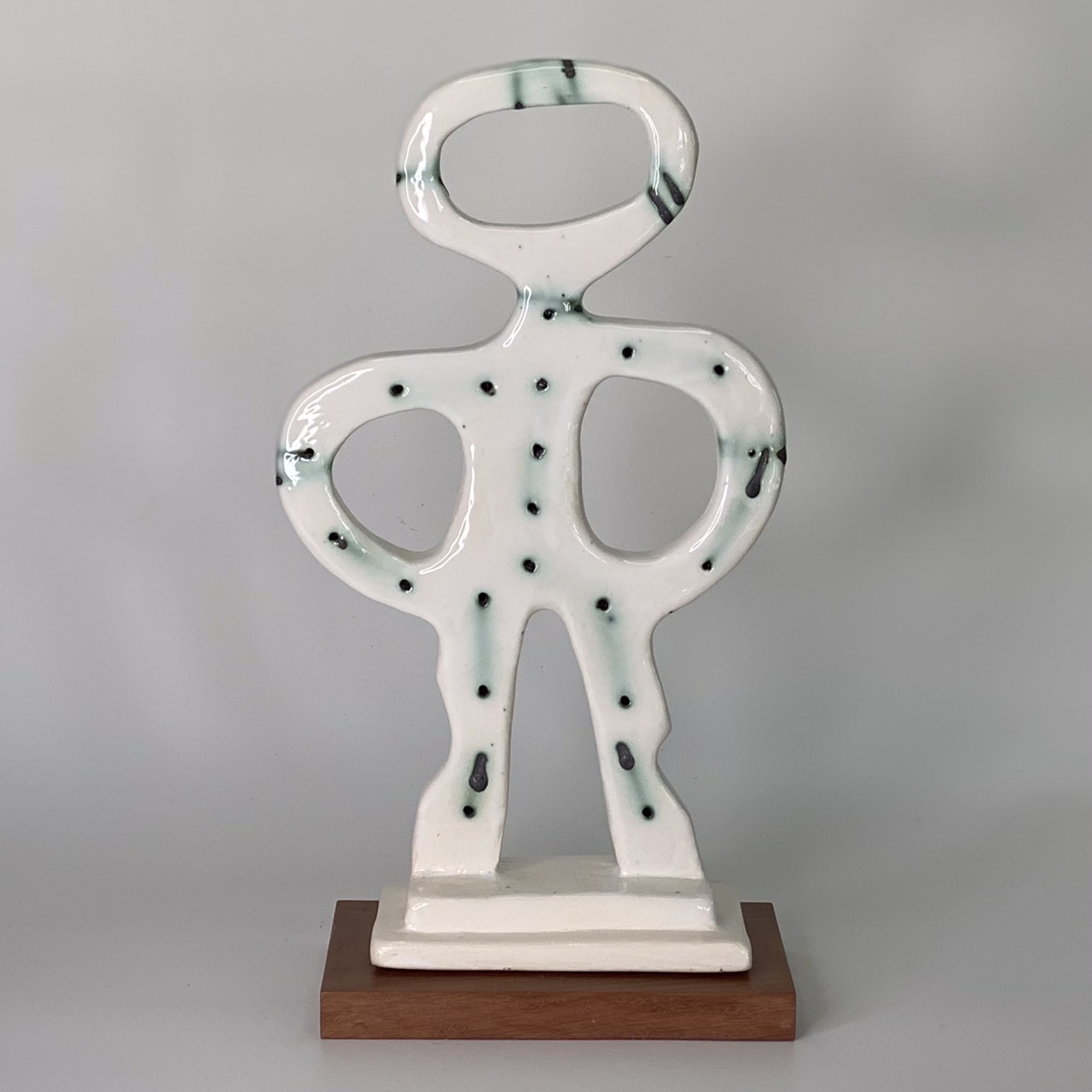 Mr Zero by Stefan Mager – Made from white clay. The subtle markings resulted from inserting a copper wire into the wet clay. During firing, the wire evaporates, leaving soft blue-green markings in the oyster white glaze. Enjoy holding and touching this unusual piece. The wooden base has been waxed and polished.