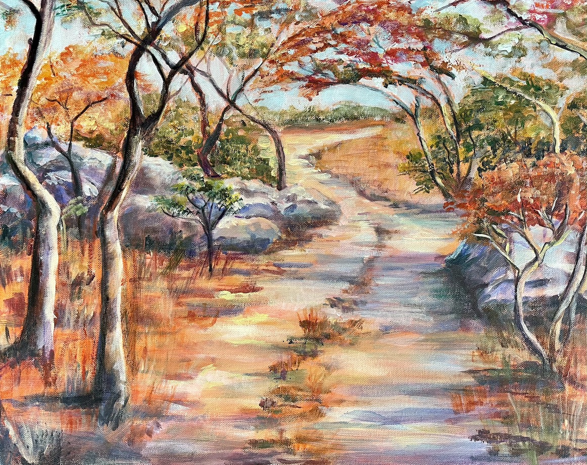 Msasa by Sue Hill – This acrylic landscape is of Msasa trees in the bush with a dusty road leading through it. Sue grew up in Central Africa and is inspired by these trees in their beautiful autumn colours in the spring. They are painted from her nostalgic past and her wish that one day she can visit the African bush again.