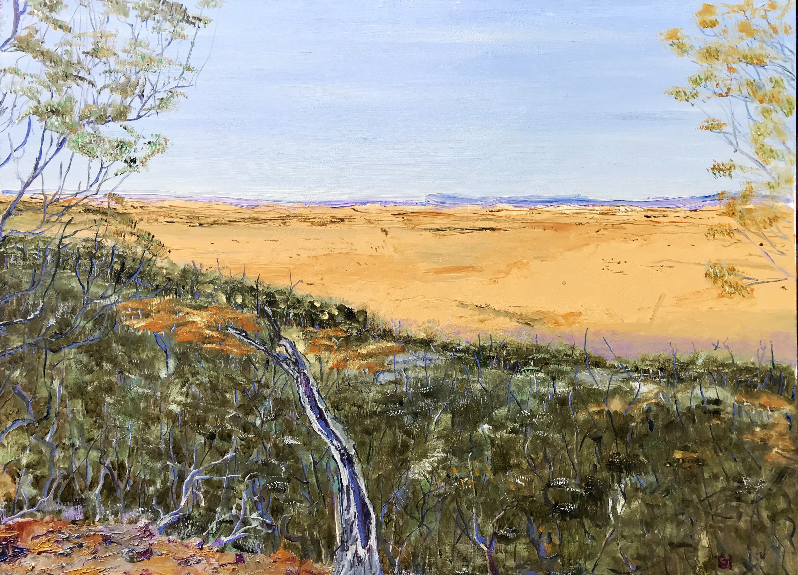 An Original oil painting of the view from Mt Slowcombe in Queensland. Looking out across the plains of central Queensland.oil paints on a cradled wood panel, sides painted black, ready to hang with a wore across the back.