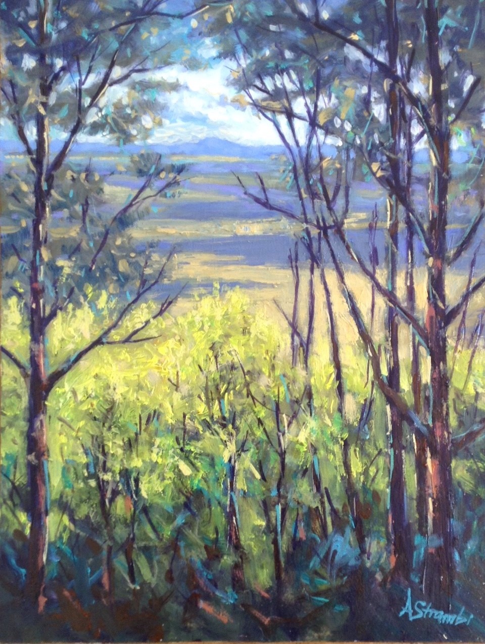 Mt Tamborine Memory by Anne Strambi – For many years I have visited Mt Tamborine to attend art workshops and have many memories of the wonderful views looking through the trees over the distant hills. This painting was started at one of the lookouts and finished in the studio and I have also made a few touches just using my imagination. The painting is framed in a double frame and ready to hang. The frame measures 40 cm x 50 cm.