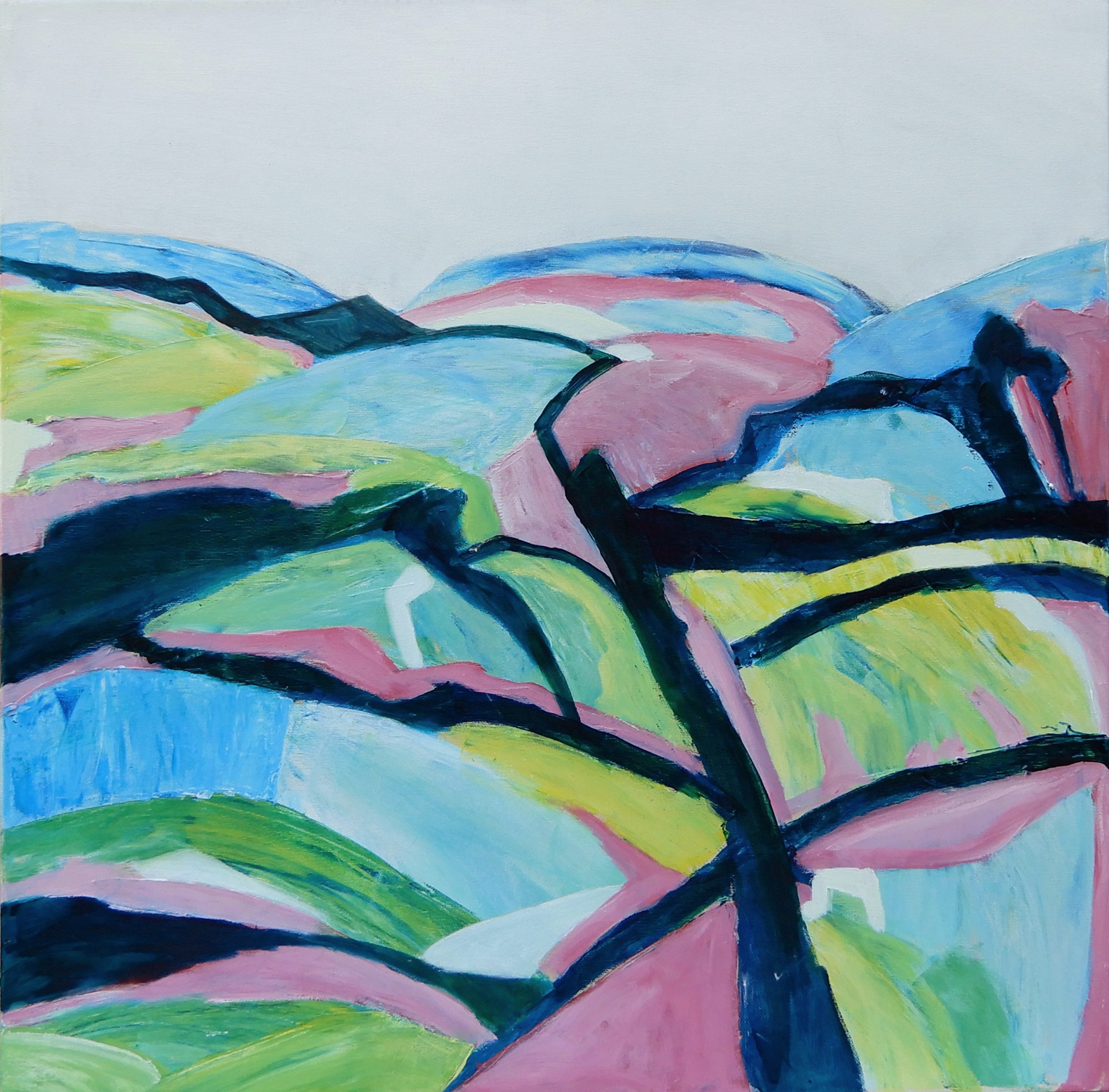 Mulberry Sundae by Doodie Herman – Mostly painted with a palette knife, this artwork is one of those happy accidents that happen when you decide not to waste paint from the day before, then add one more colour. I had on my palette pthalo blue and green, cadmium red and titanium white and added primary yellow. I decided not to mix the colours but to scoop them up neat with the palette knife and see what the results were in blending them straight onto the canvas. Some areas I worked over later with a brush. This was really a fun artwork to paint.
