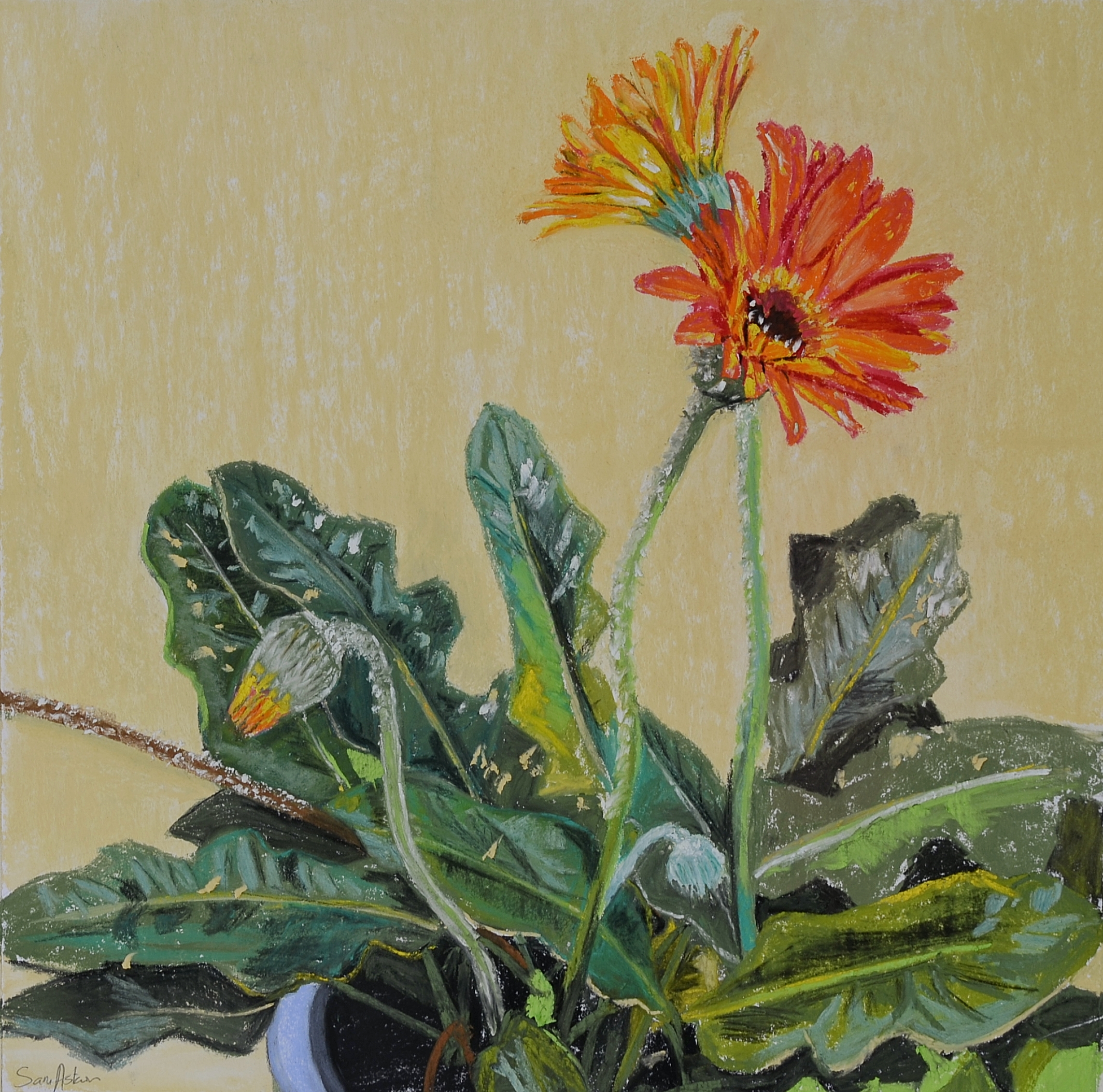 I really enjoy painting and drawing botanicals. My parents have surrounded themselves with their own nursery on their patio and at most times of the year something is in bloom. I have been really wanting to do a rose close up in pastel and went around to see what they had to show off. Nothing took my eye, but down next to the rose bushes was this small, unassuming pot of gerberas. It was justice to bring their vibrancy to life with soft pastel, layering reds, oranges and yellows set against their neutral background. Perfect to light up any room!