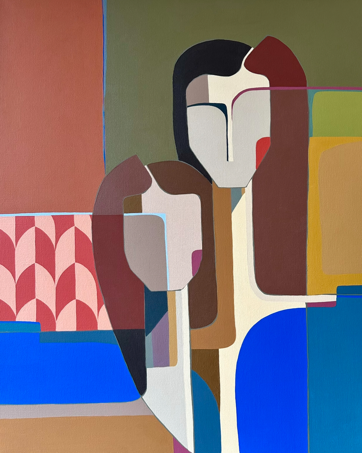 ‘Mum’s The Word’ by Gina Ward –Â is an unspoken connection between two women, subtle geometry alongside vibrant tones evoke both warmth and tension. Despite this bold palette, there is a palpable sense that something must remain unsaid, a secret to be carried in silence and hidden truths.