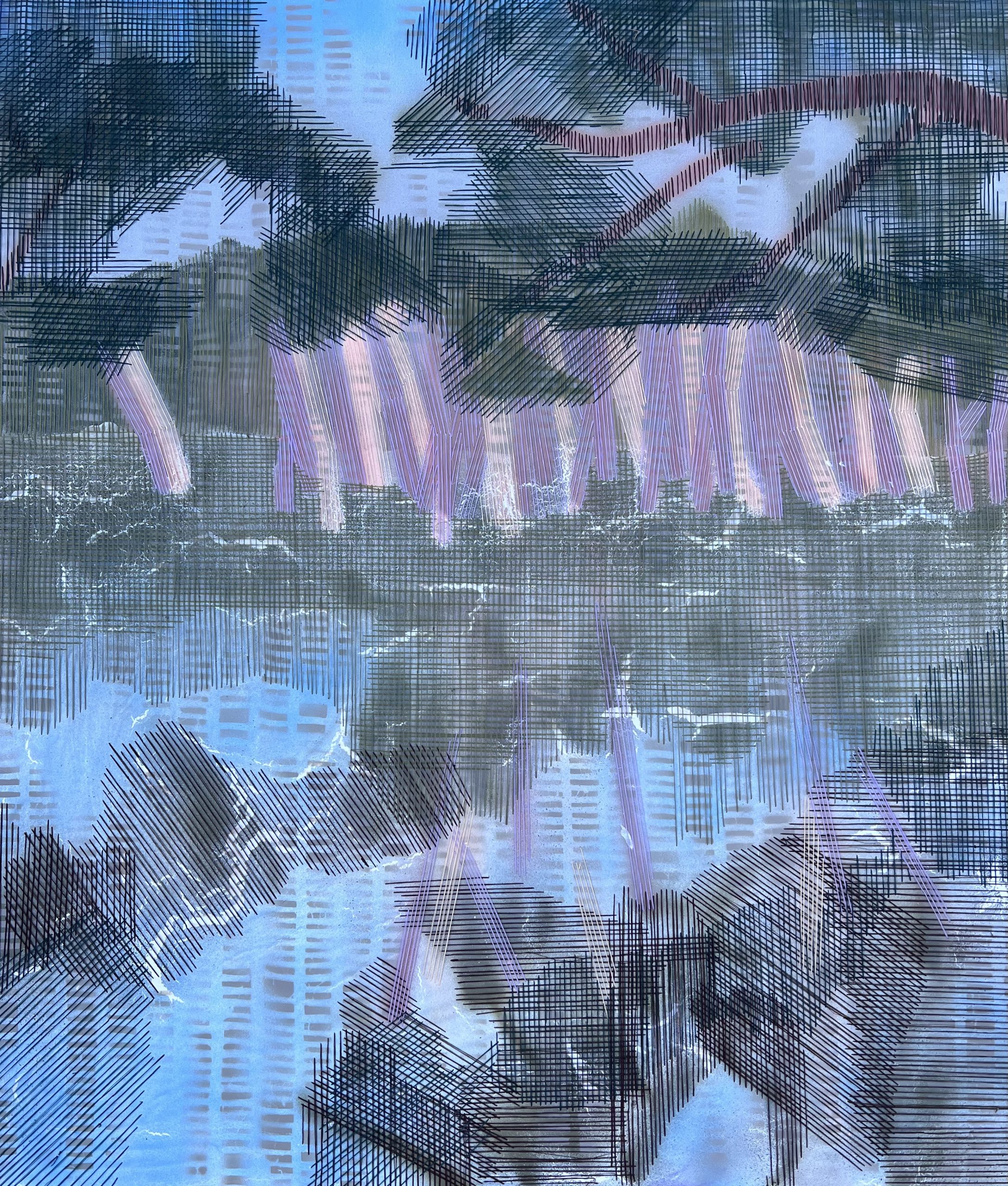It is a combination of acrylic, spray paint and hand embroidery on canvas.