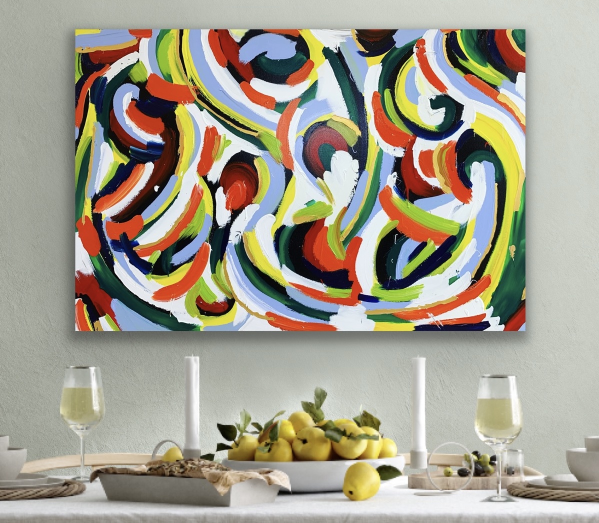 This painting is inspired by Jackson Pollock’s painting ‘Mural’. Alicia watched the 2000 movie ‘Pollock’ and painted Muse the next day. She felt the name Muse is fitting for this painting as Pollock is a source of inspiration for several of Alicia’s paintings.