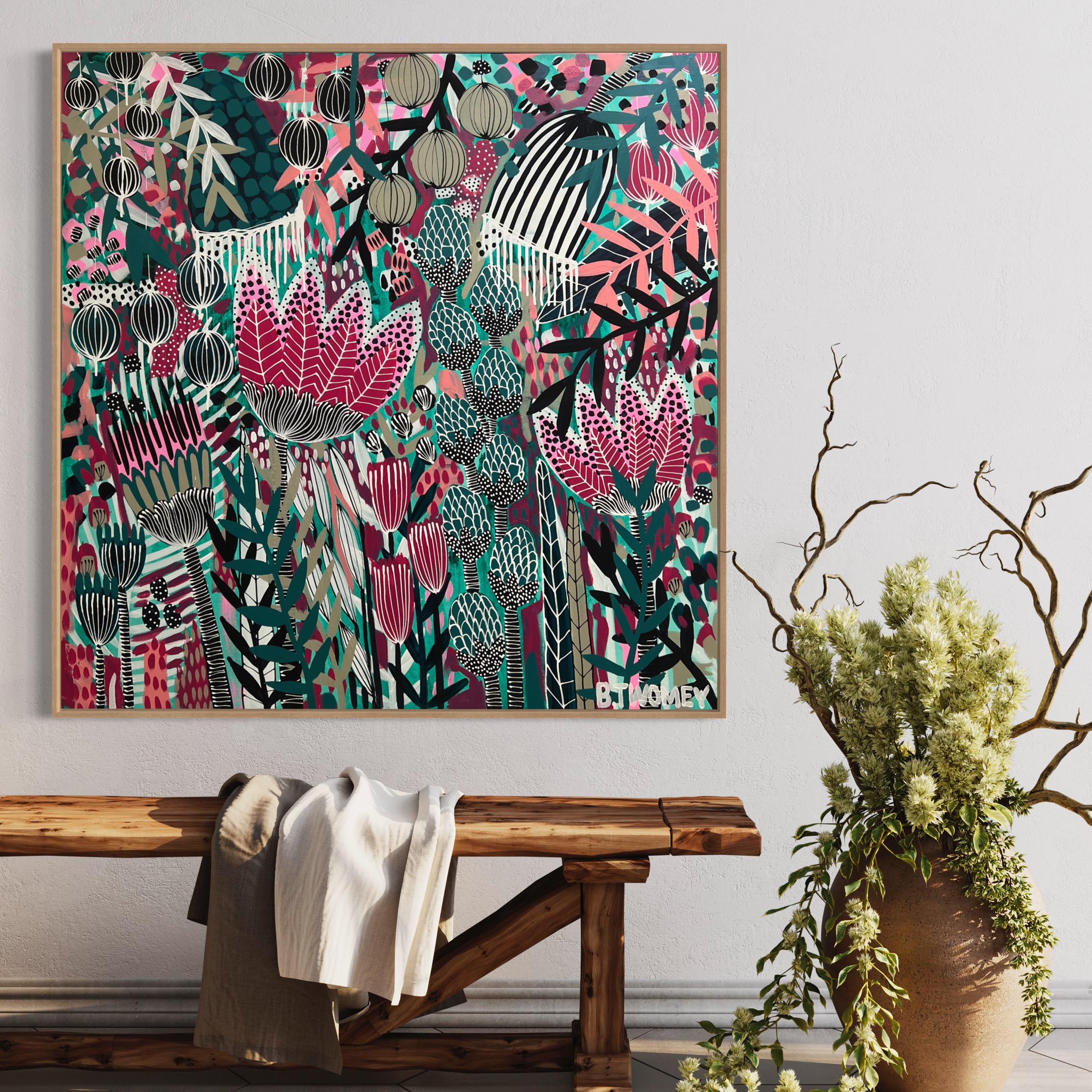 An original artwork on triple primed gallery quality canvas, ready to hang in sustainable hardwood float frame. 122cm x 122cm canvas size (125cm x 125cm framed)