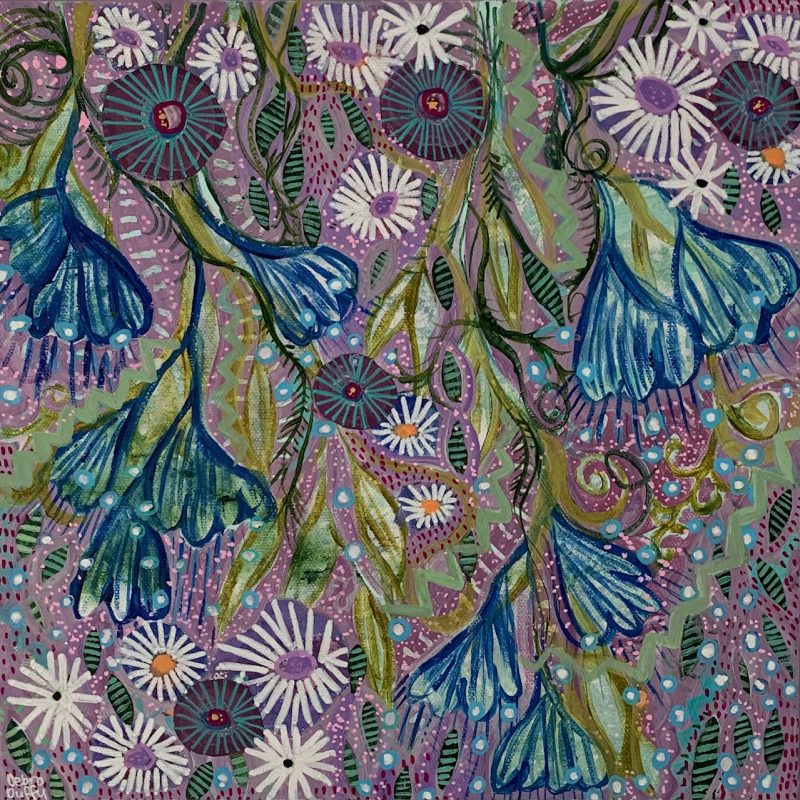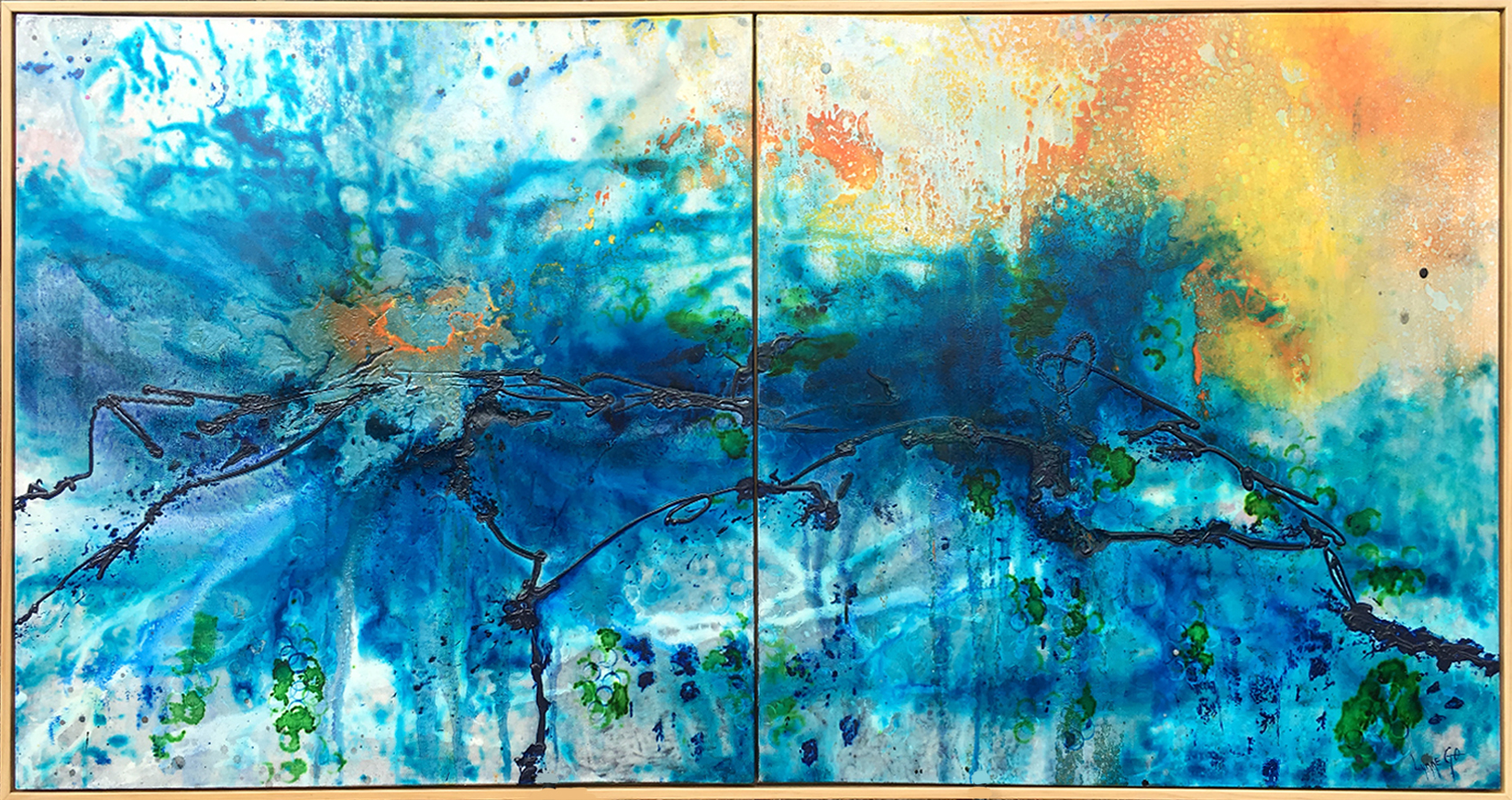 A beautiful, vibrant diptych housed in a custom made pine frame. Exudes fun, happy days with flowing blues, yellows and greens.