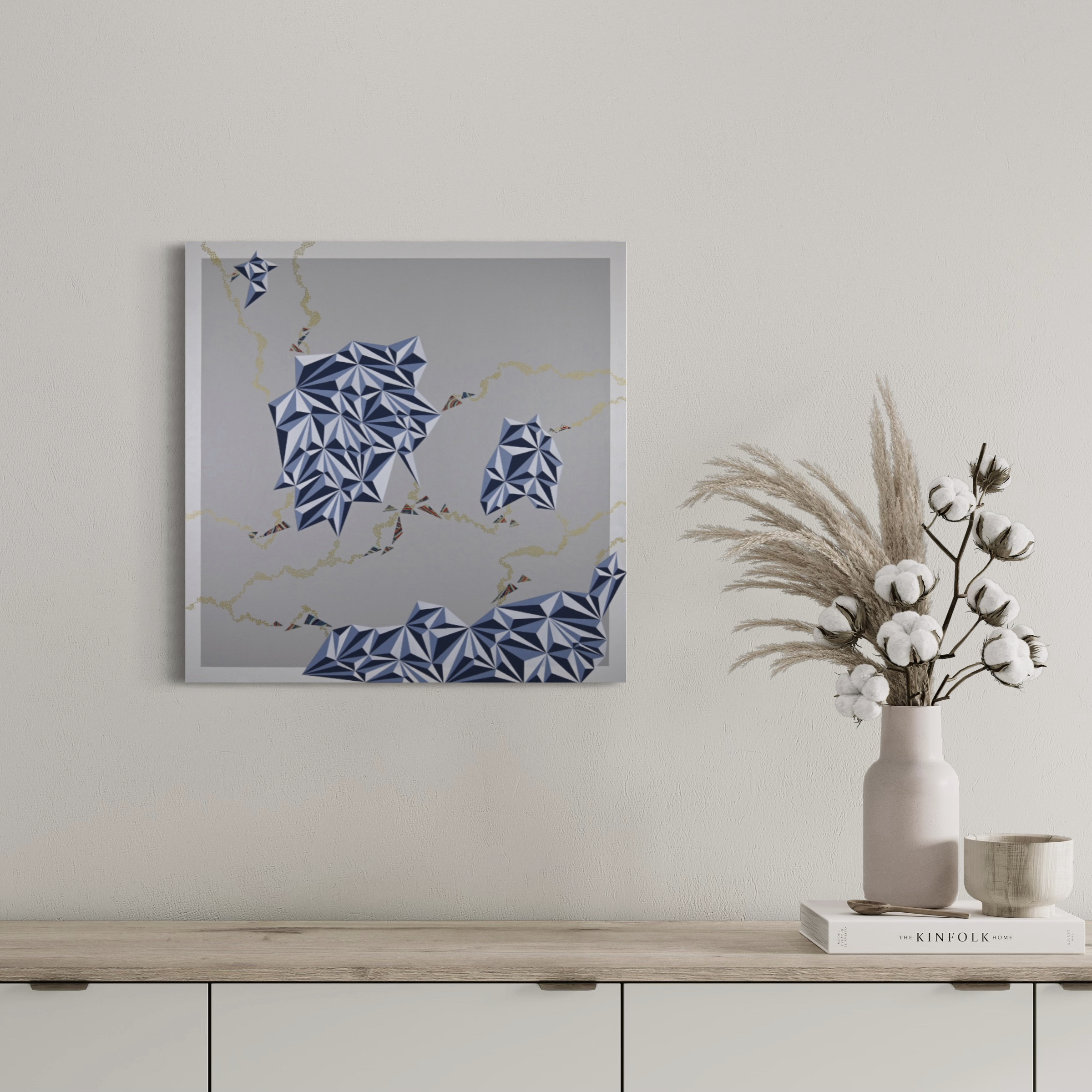 Inspired by snorkelling with my sisters as a child on the east coast of Tasmania, and then seeing my son discover the joy of the underwater world on a trip to Fiji, this piece is an aerial view of a coral reef, with origami paper and gold bubbles representing aquatic sea creatures and the spawning of the reef.