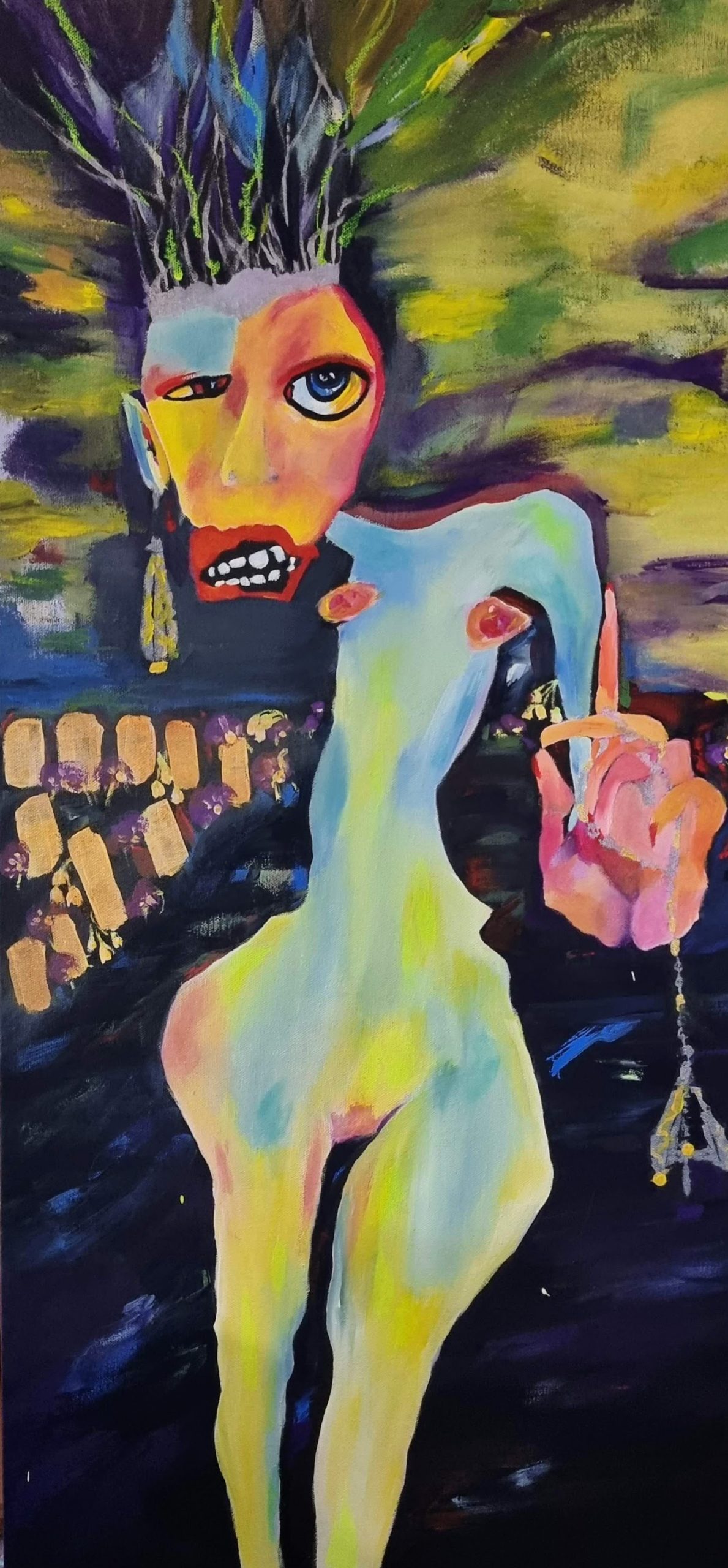 As I was painting this piece, news from the USA regarding the overturning of the Roe v Wade ruling and the resulting implications for women everywhere occurred. Apart from being outraged and angry at these choices being taken away from a woman and her body, decisions made with religious zealotry, made me stop in my tracks…467 odd years apart and we humans still haven’t got a handle on what it is to be human. Religion is still being used as a weapon. Power, fear and control used in the guise of Christian morals. So this can be viewed as a strong woman in control of her own body, proffering these very utensils of torture to anyone that stands in her way