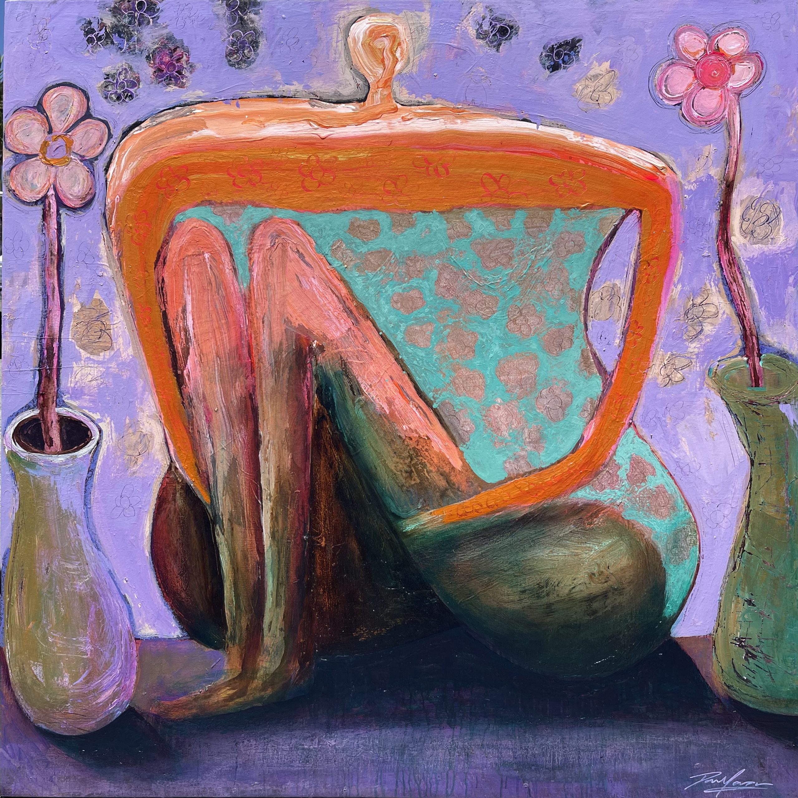 Portrait of a female form sitting between two hand picked flowers in vases, with purple background.