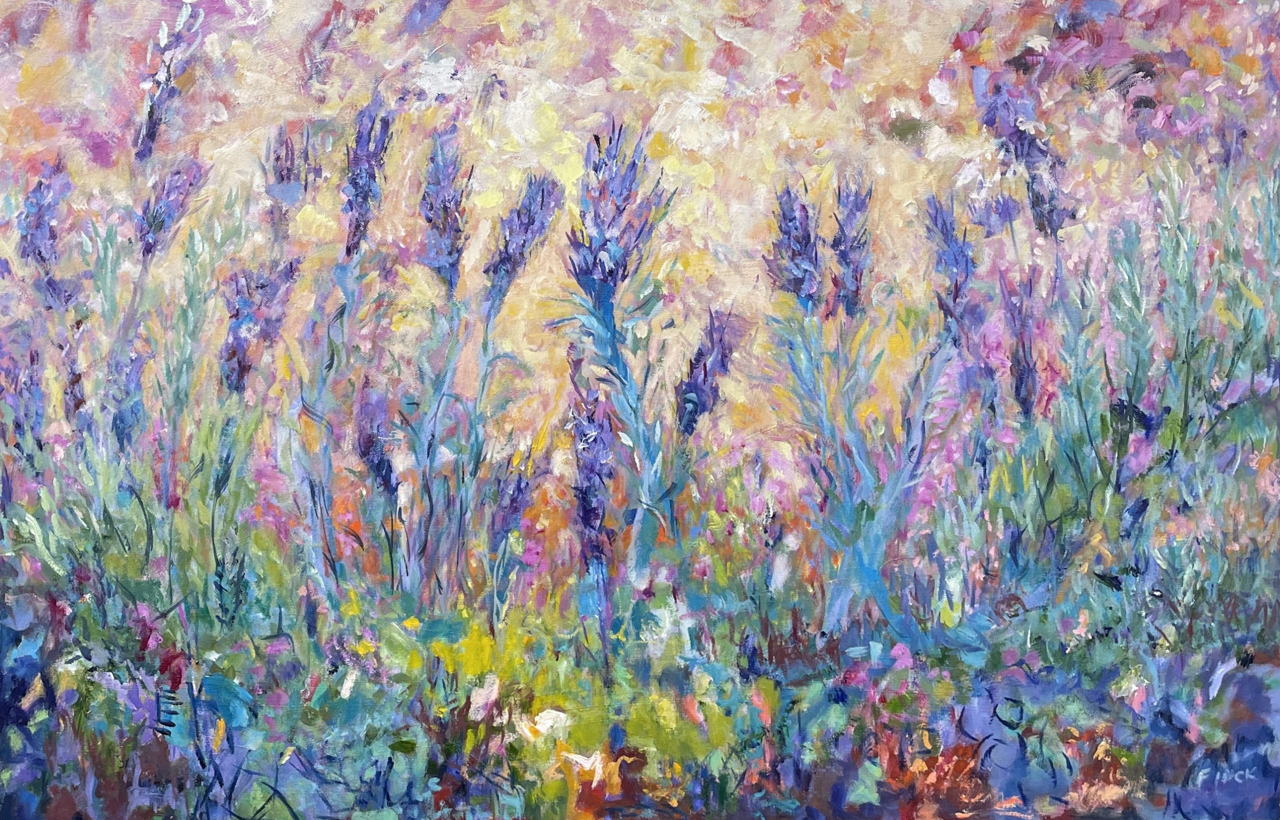 An impressionist oil painting of lavender in bloom, against a pink and orange stone wall. Other colours include green, blue turquoise, yellow mauve and white.