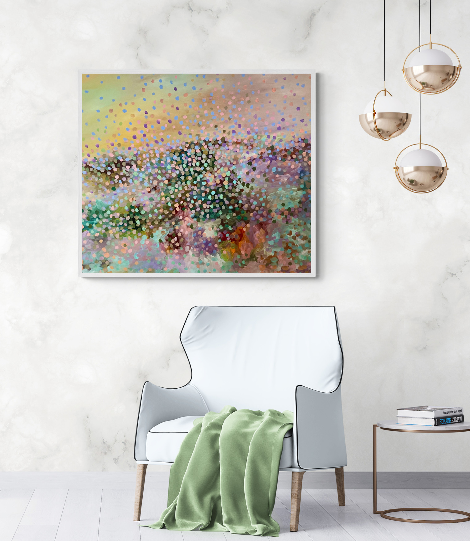 My Magical Forest by Theo Papathomas  a very soothing and tranquil painting where sky, clouds, sun, and petals come together to create this beautiful harmonious landscape. Capturing the beautiful colours of the petals falling from the sky onto the landscape like a veil covering the whole hill with the rays of the sun falling onto the petals . I tried to create so much depth in the painting. A very harmonious and tranquil composition that invites the viewer to become one with the Forest. A magical place to meditate and hear the songs of the Forest. The painting does not come with an external frame.The painting is signed and dated 2021 at the back and comes with a certificate of Authenticity.