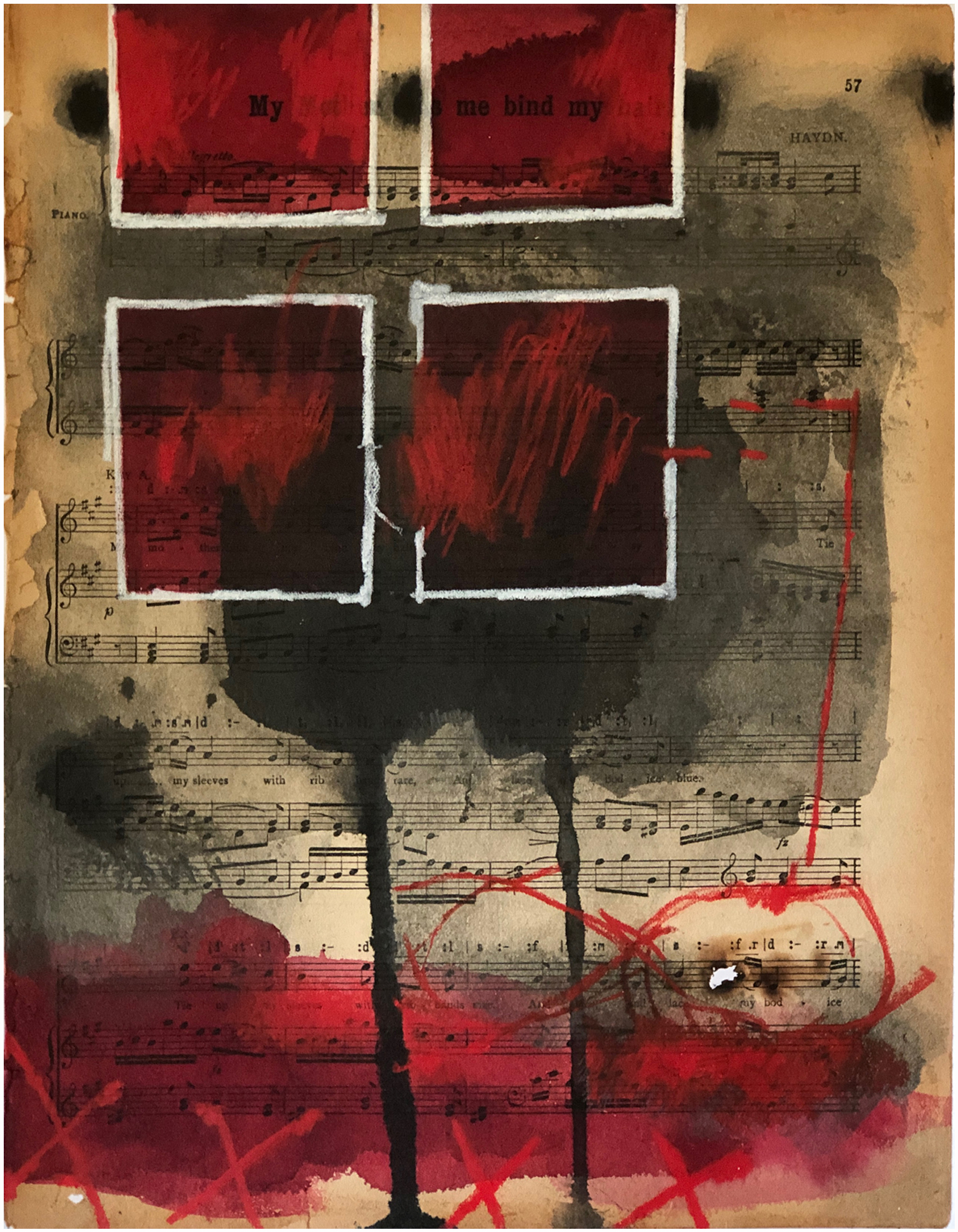 “My Me Bind My” is part of a series complete on vintage music paper adhered to cardboard. The smaller size allowed the work to mature quickly, relying more on marks. Layered grey lead pencils [various types], inks, acrylic paint colour, oil sticks, hand printing techniques.