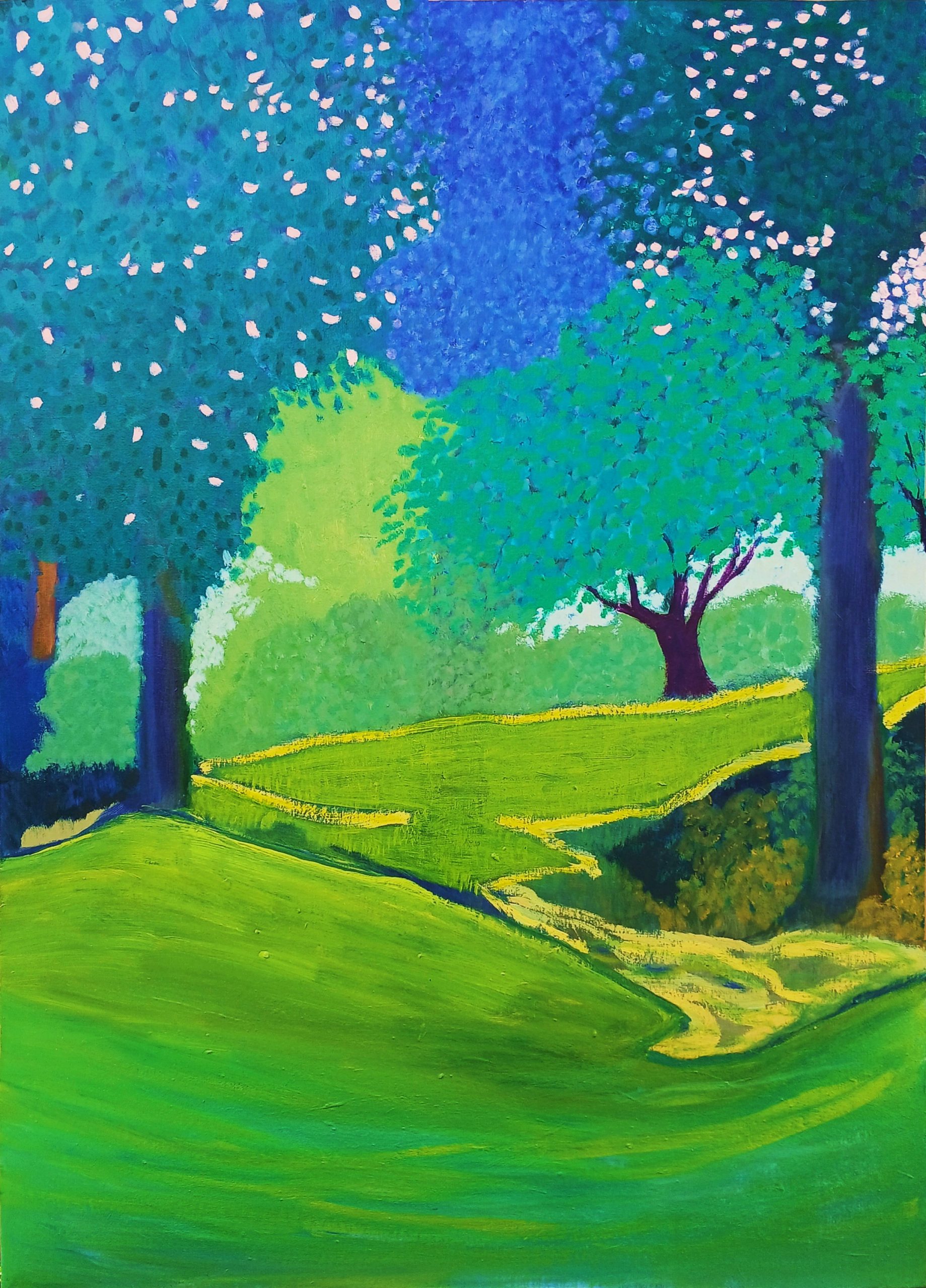 Crafted with acrylic and household paint on canvas, this medium-sized piece is ready to hang and bring a touch of nature to your wall. The artwork invites the viewer to recall their own treasured memories and experiences in nature. The tree, now gone, lives on in the artist’s memory and is immortalized in this moving painting.