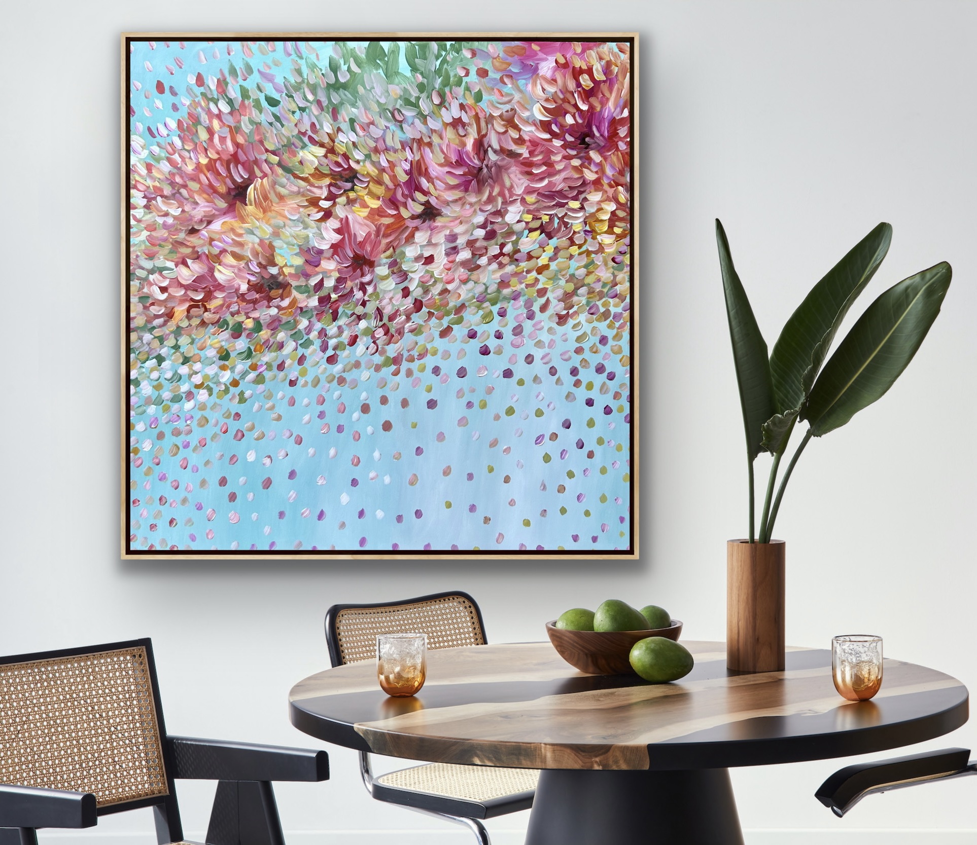 My Only Love by Theo Papathomas a painting with beautiful warm colours of the petals flying in the wind creating fireworks in the sky. Like beautiful jewels shining like stars in the sky. Capturing the light of the sun falling on to the petals creating a beautiful bouquet of Petals . Petals weeping onto the landscape creating this beautiful veil of colours against the blue sky . A composition of colours and rhythms of petals dancing in the sky like musical notes . A very peaceful and tranquil painting with so much depth .