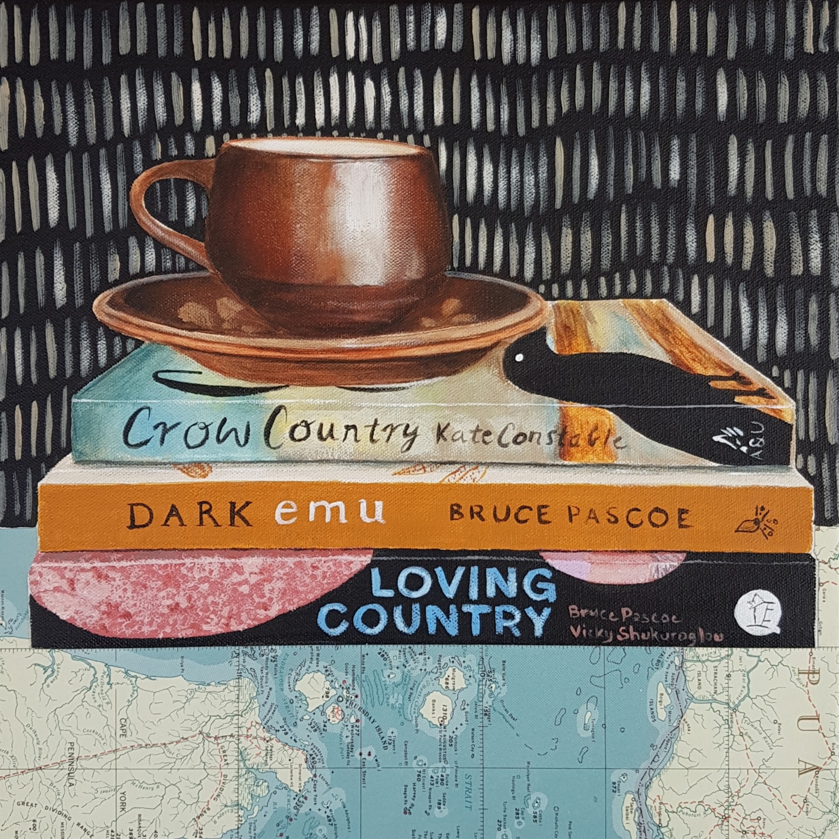 Books can teach us so much, My daughter had to read ‘Crow Country’ for school and it talked about places that her father grew up in as a child. I find books to be a wonderful place to escape and learn from. Part of the background is collaged in a beautiful vintage map. The painting is done in a modern contemporary style but still draws from traditional still life paintings for inspiration. This painting is framed in Australian Oak.