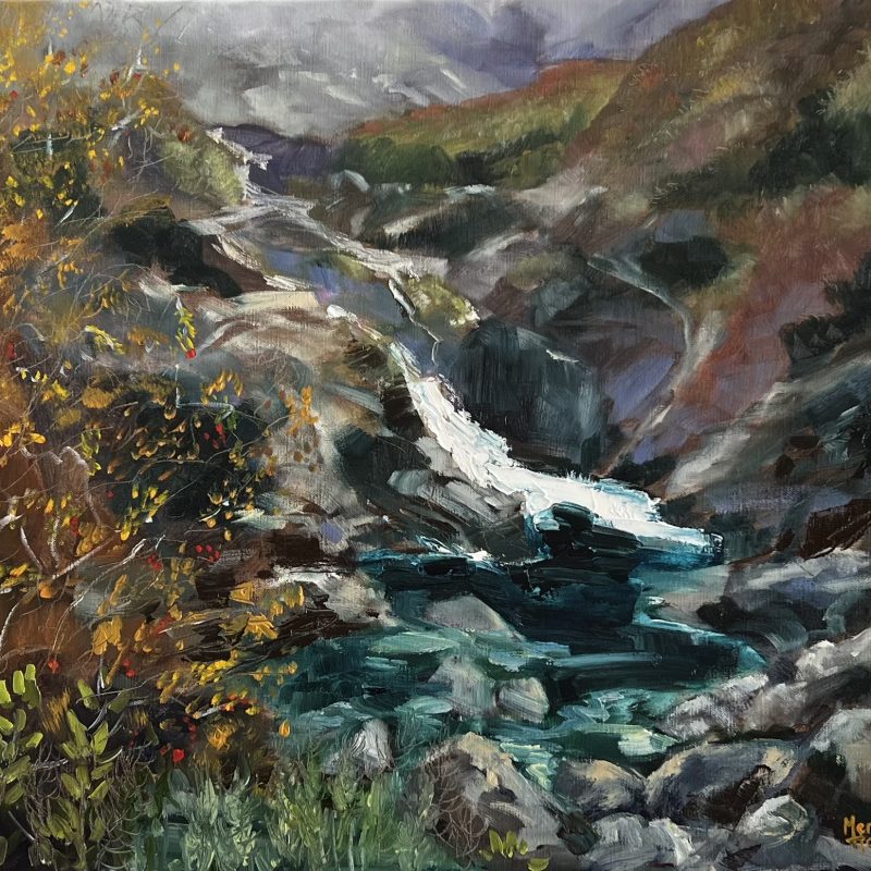 My Place by Olga Megele. This landscape contains beautiful, multiple layers of texture and colour. It glows with rich ochres, sienna and greens. Broad confident strokes of the palette knife are evident. A stunning piece.