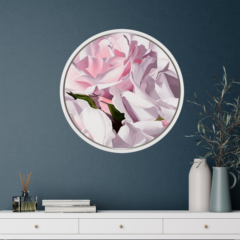 ‘My Rose Garden’ painted with the highest quality acrylic paint onto this stunning round canvas which is beautifully framed in painted white timber.
