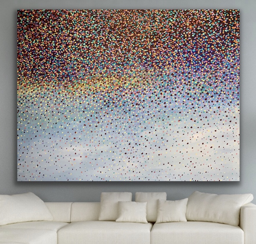My symphony of Petals are swept by the winds creating their own musical notes in the sky before falling on to the landscape. This painting is painted with a pallet knife with thick oil paint on linen.The painting is very textured and thickly painted. I tried to capture the beautiful rhythms of the petal movements swept by the winds creating my own personal symphony with the colours of the petals Hope with this s work it makes the viewer feel very peaceful and tranquil. This painting is signed and dated 2019 at the back of the painting and comes with a certificate of authenticity.