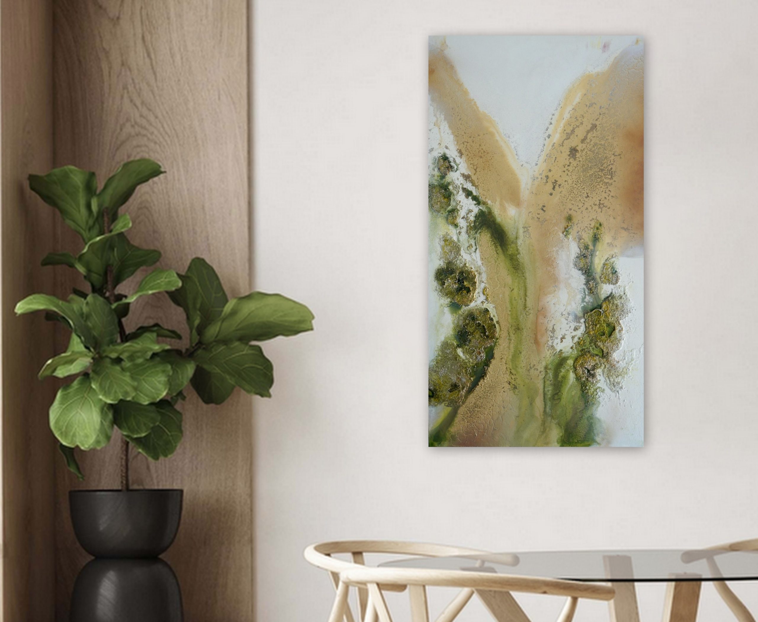 Green Abstract Wall Art “Mystic Marshlands” by Petra Meikle de Vlas – is a highly textured, 3 dimensional, abstract aerial view of the ocean.