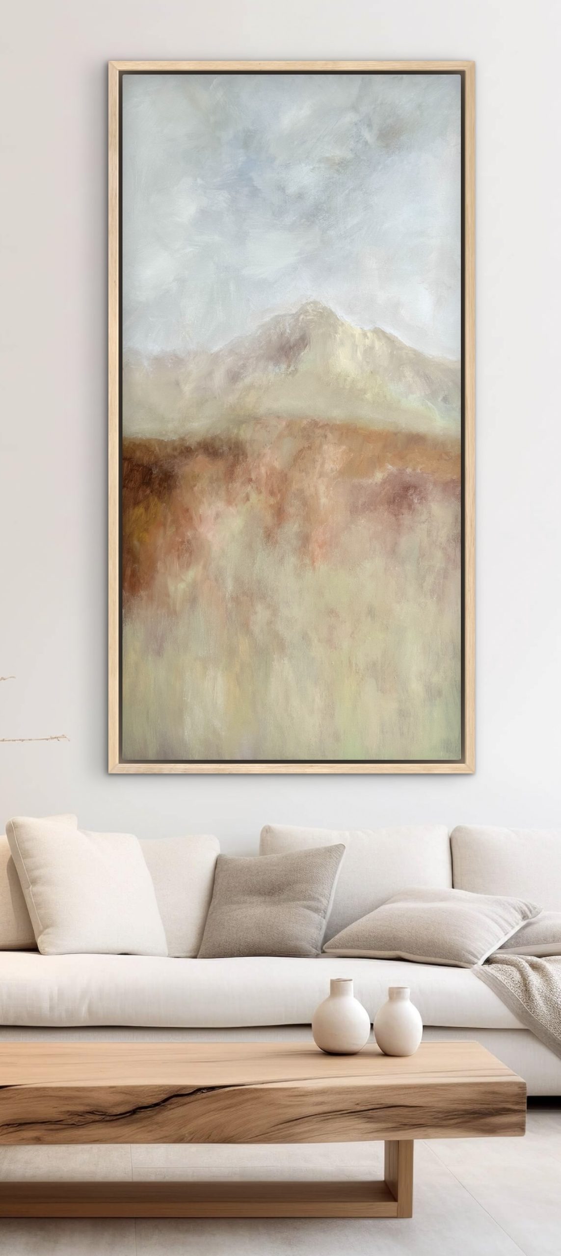 Is a painting celebrating colour and light of the Australian landscape. A very soothing and tranquil painting where sky, clouds come together to create this beautiful harmonious landscape. Capturing the beautiful colours of the Australian landscape , browns, ochre and pastels against the light colours of the sky. Clouds covering the hills and capturing the beautiful rhythms of the landscape. Painted in a very expressionistic way with acrylic paints, with lots of layers of paint . I tried to create so much depth in the painting .A very harmonious composition of colours and forms that makes it a very contemporary painting . This painting does not come with an external frame.The painting is signed and dated at the back and comes with a certificate of Authenticity