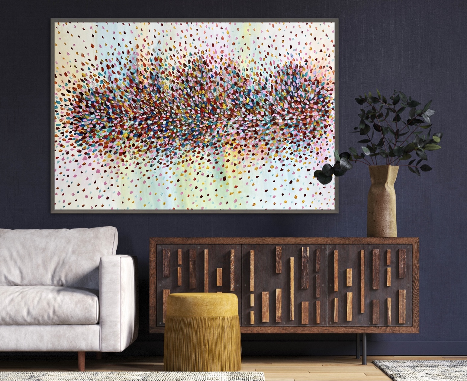 Mystical Rainbow by Theo Papathomas – a beautiful rainbow of petals in the sky falling onto the landscape creating an electric explosion of petals. Fireworks of petals in the sky like musical notes dancing to their own song against the beautiful light sky. Hope with this work it makes the viewer feel very peaceful and tranquil. I tried to create so much depth in the painting and filling the Sky with petals like shooting stars . The painting is painted in acrylic paint with a pallet knife creating so much texture.which makes the painting three dimensional. The painting does not come with an external frame .The painting is signed and dated 2022 at the back and comes with a certificate of Authenticity.
