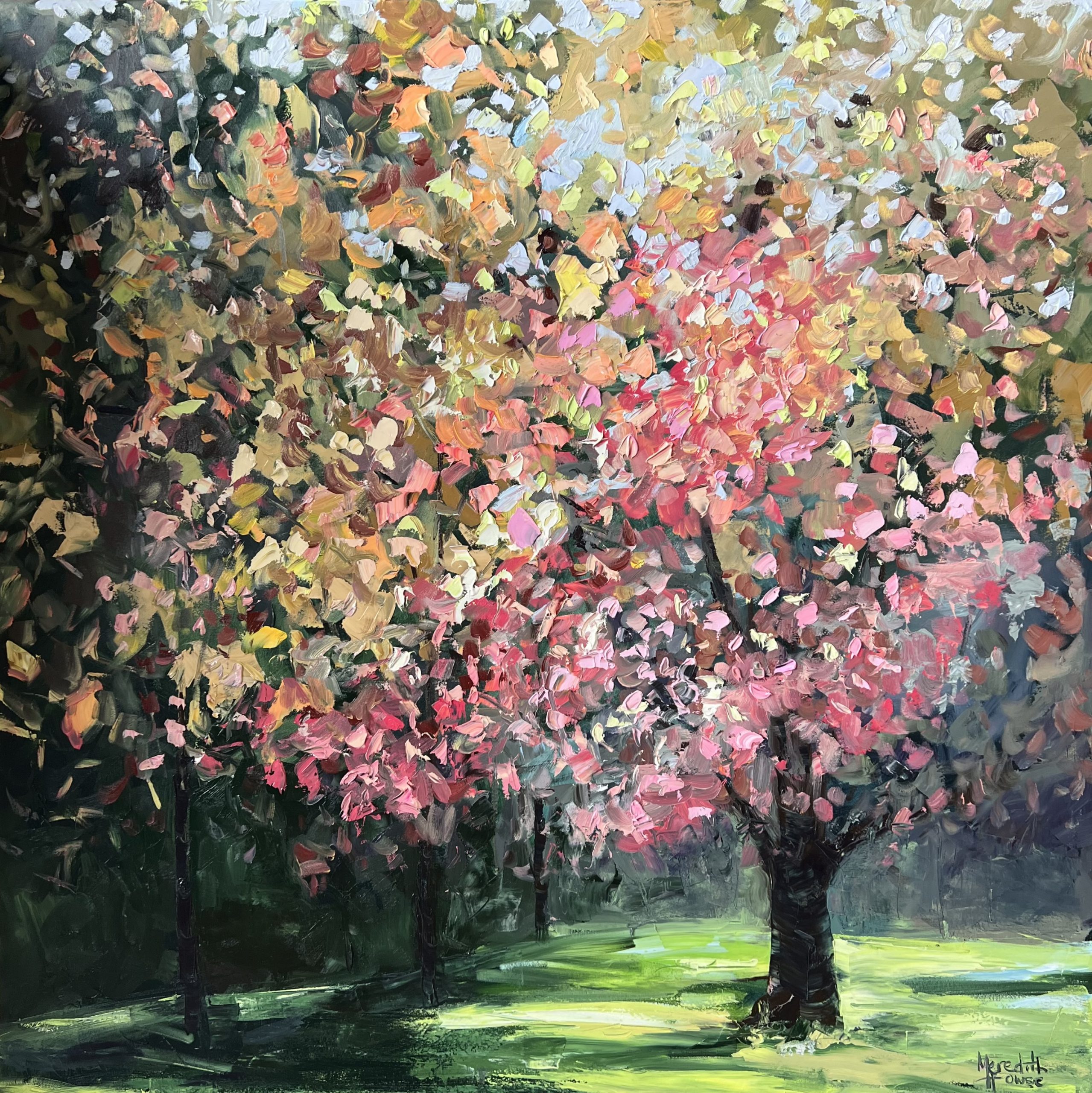 ‘Nana Glen’ by Meredith Howse is an colourful oil painting inspired by the vibrant autumn leaves of Archie Hunter Memorial Park in Nana Glen, NSW. This textural piece presents a composition of colour, movement, and light, immersing the viewer in the beauty of Autumn.
