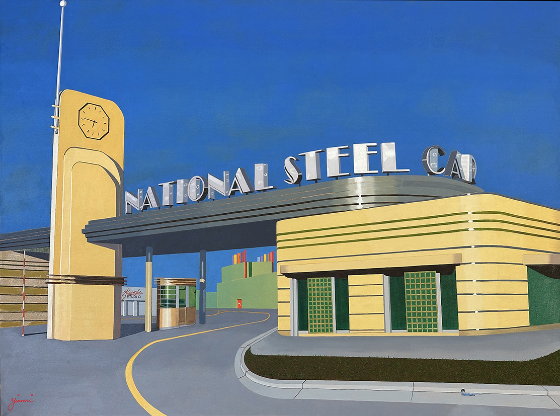 National Steel by Yianni Johns – This painting was part of my Adoring Art Deco solo exhibition held in Leeton Museum Gallery in 2024. I love the shape and light in this wonderful Art Deco Building. The building formally an aircraft building factory in the second world war is now a railway car manufacturer. I painted it because I love the way it looks.