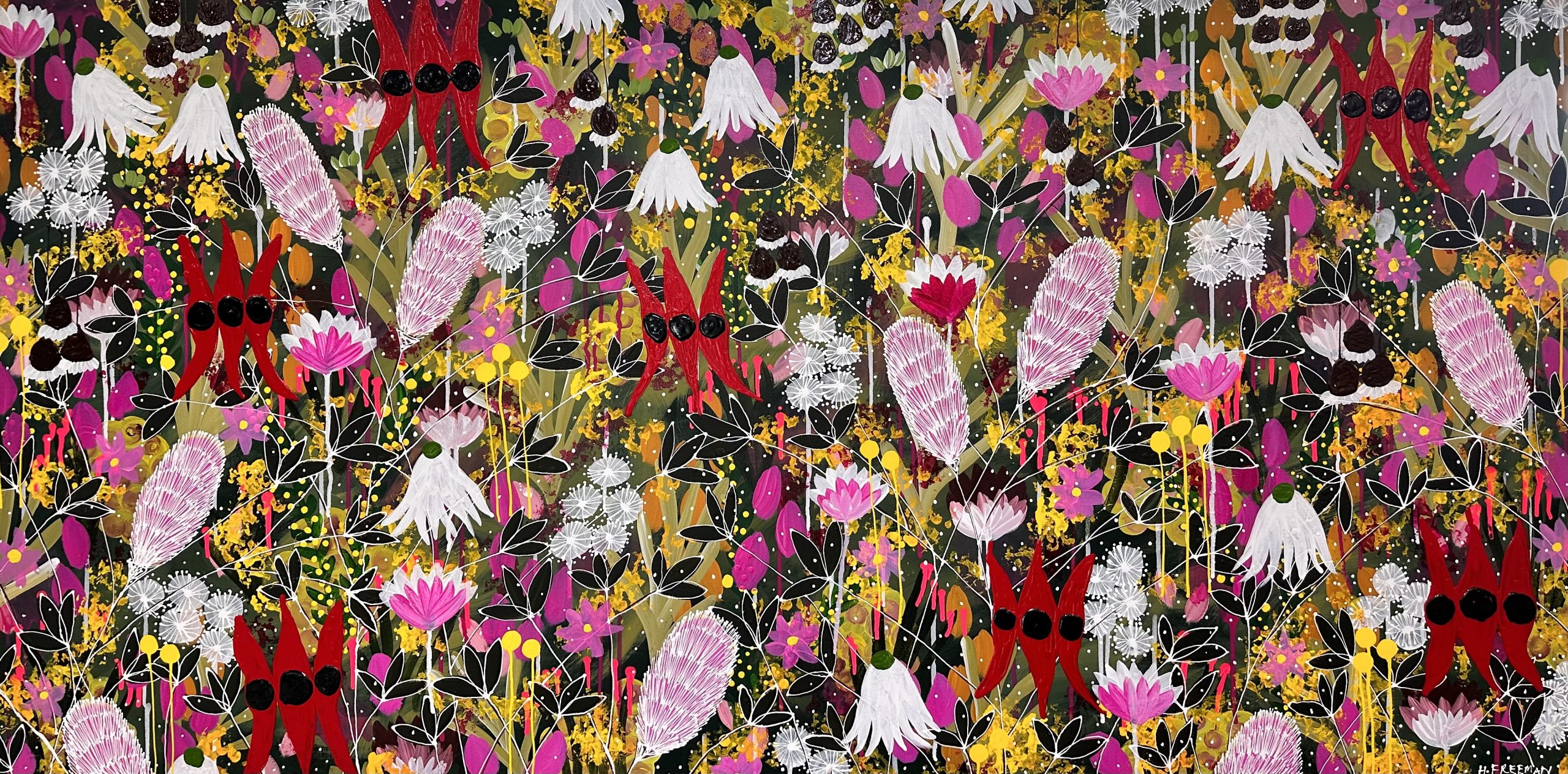 This artwork draws inspiration from the rich beauty of native Australian flora, featuring vibrant Sturt desert peas, striking banksias, delicate flannel flowers, cheerful billy buttons, whimsical flowering gumnuts and gorgeous wattle. Each bloom is carefully portrayed to celebrate the unique colours, textures, and forms of these iconic wildflowers, creating a piece that brings the essence of Australia’s natural landscape to life. Through a harmonious blend of detail and colour, the artwork captures the wild elegance of the Australian bush, inviting viewers to experience the charm of these native treasures.