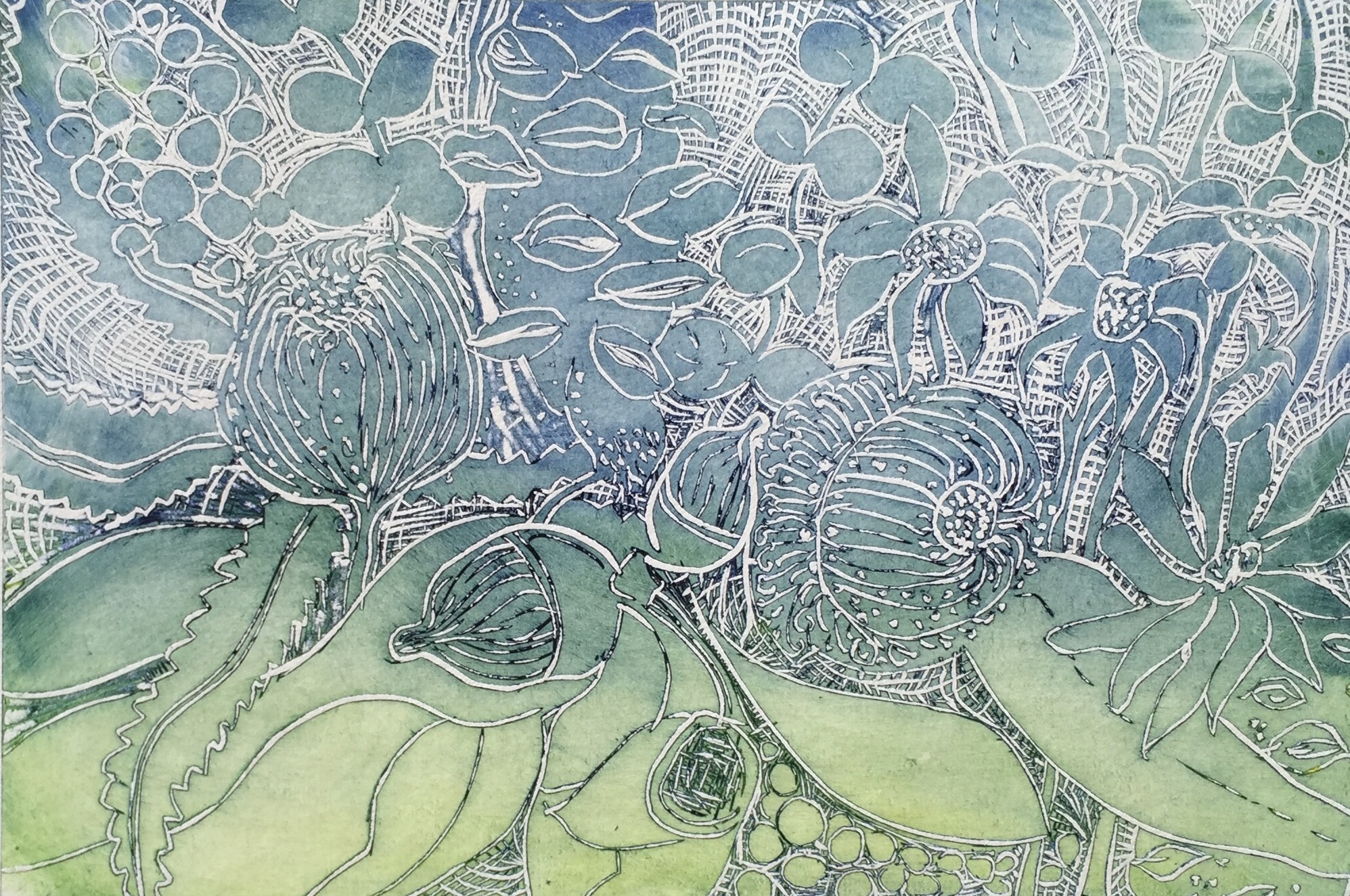 Australian native plant and flowers are an enduring delight, nourishing my world both as a garden enthusiast and as an artist. I enjoy the process of creating each print, no two are ever the same, varying colours, ink and paper lifting each off the press is exciting. Limited Edition print, signed and numbered with a Certificate of Authenticity. Unframed. The photo of this print doesn’t do justice to the delicacy and quality of the inks and detail of the print.