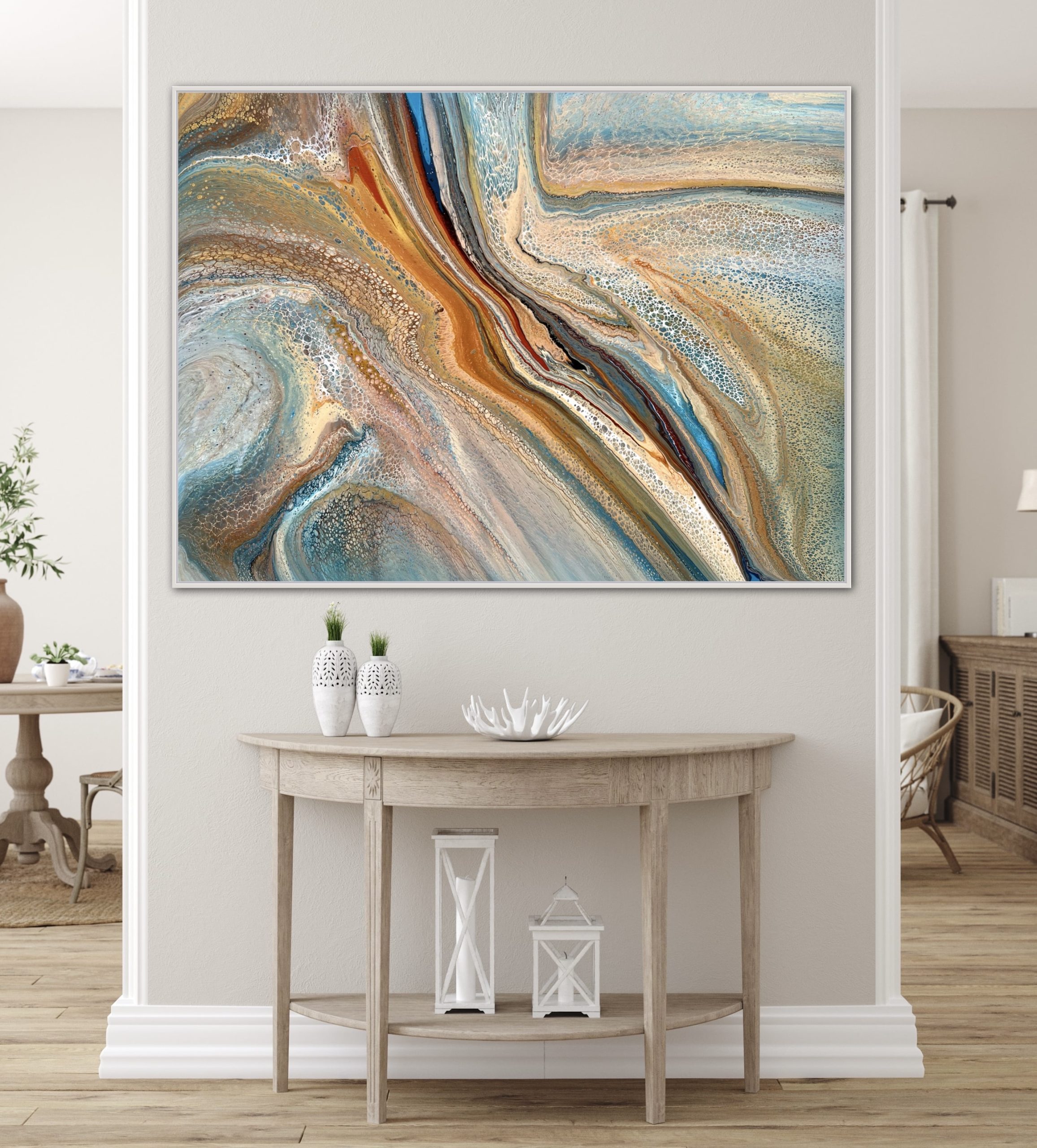 Natural Balance was created using various techniques combined to allow increased flow, interaction and separation of colours to create interesting patterns where pops of colour can be seen emerging from underneath. This added dimension adds lace and cells to the artwork creating an interesting and one of a kind painting that can never be replicated. A lovely variety acrylic pigments were used including metallic yellow & rose gold, bronze, copper, silver, grey, cream, yellow, black, blues and white.