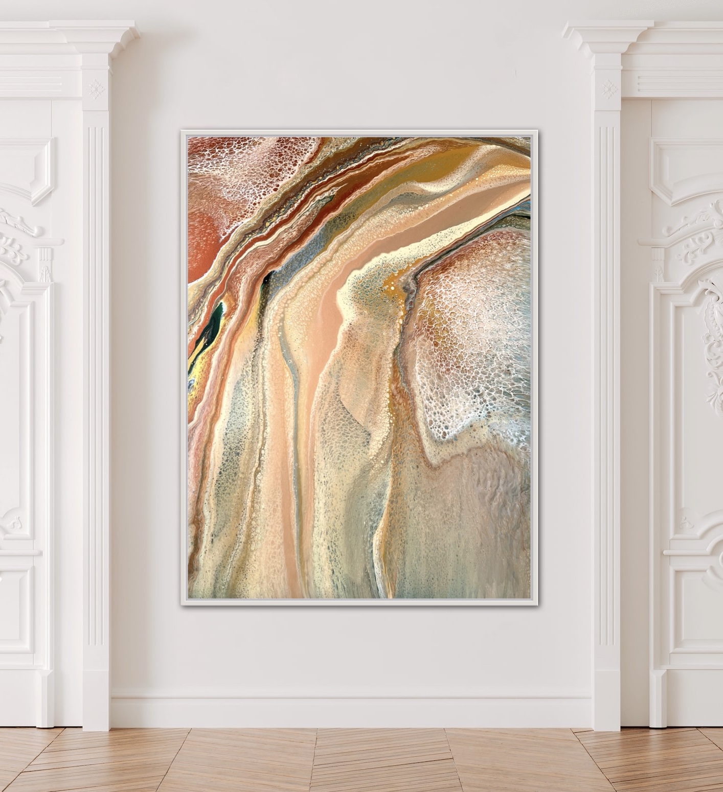 Natural Beauty was created using various techniques combined to allow increased flow, interaction and separation of colours to create interesting patterns where pops of colour can be seen emerging from underneath. This added dimension adds lace and cells to the artwork creating an interesting and one of a kind painting that can never be replicated. A lovely variety acrylic pigments were used including metallic yellow & rose gold, bronze, copper, silver, grey, cream, black, greens, touches of blue and white.