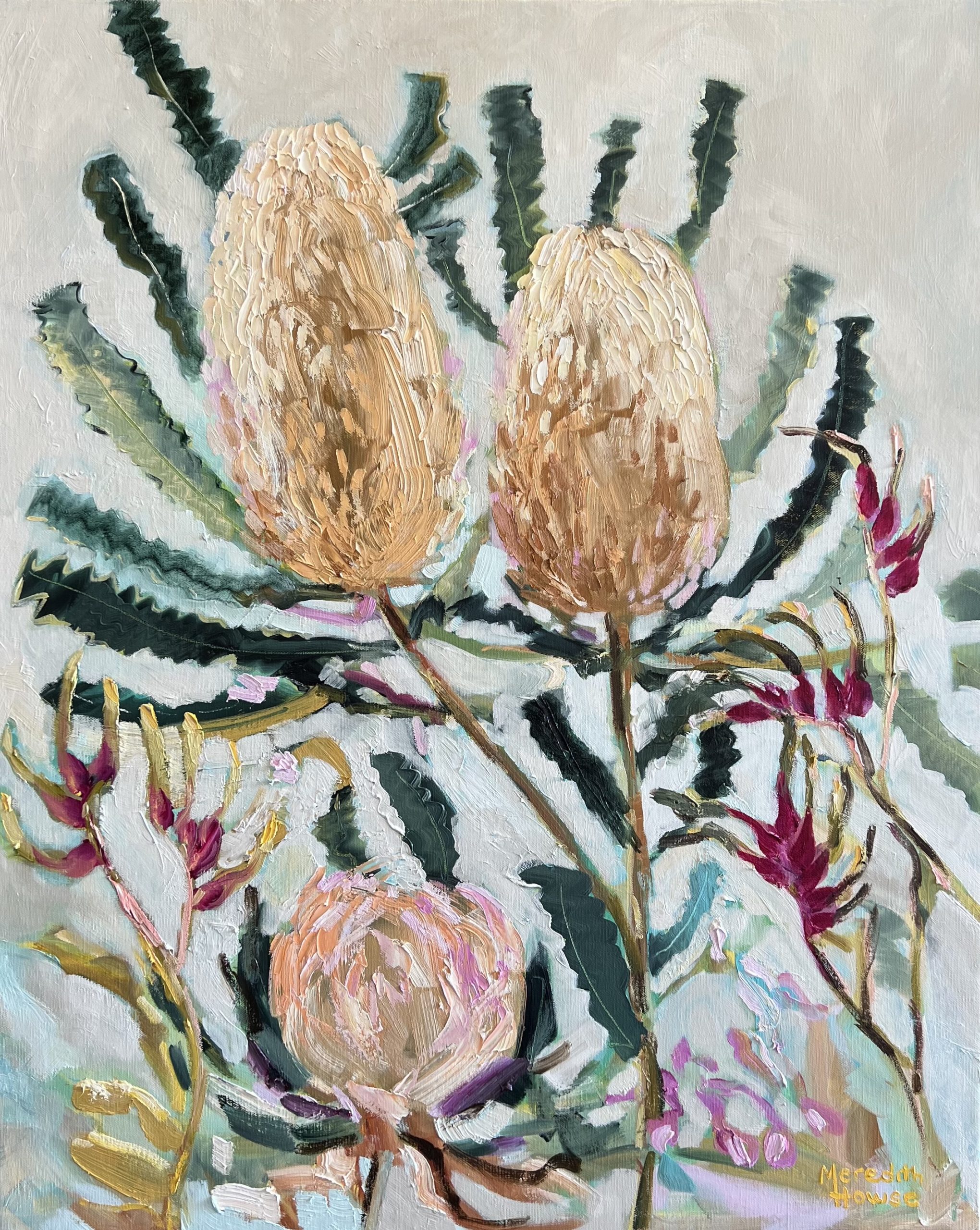 Nature by Meredith Howse is an artwork that captures the beauty of native flowers in their natural habitat. This textural painting captures the Banksia and Kangaroo Paw flowers with loose, free brushstrokes that evoke a sense of spontaneity and movement.