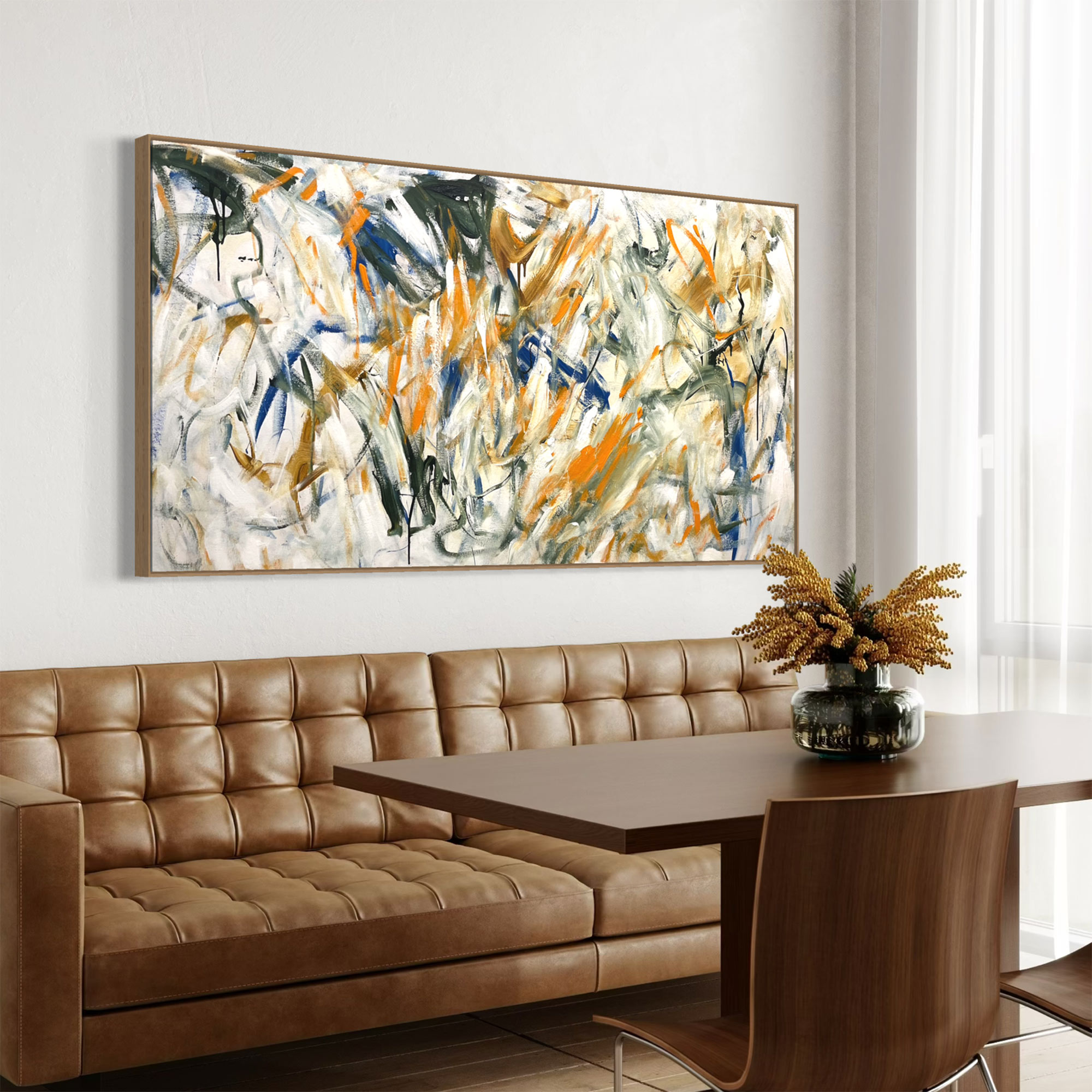 It is acrylic on stretched canvas and comes framed in natural timber.