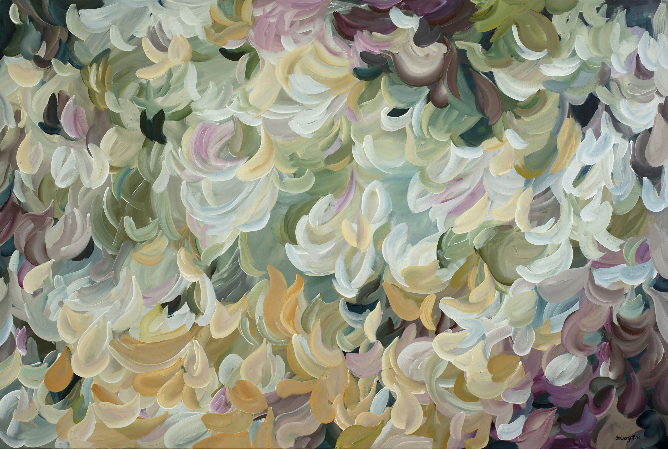 Natures Dream by Amber Gittens  – Large nature inspired abstract pattern painting 150x100cm. With the colour palette taken from nature using soft creams, beige, olive greens, warm yellow and burgundy its a calm and tranquil reflection on nature.