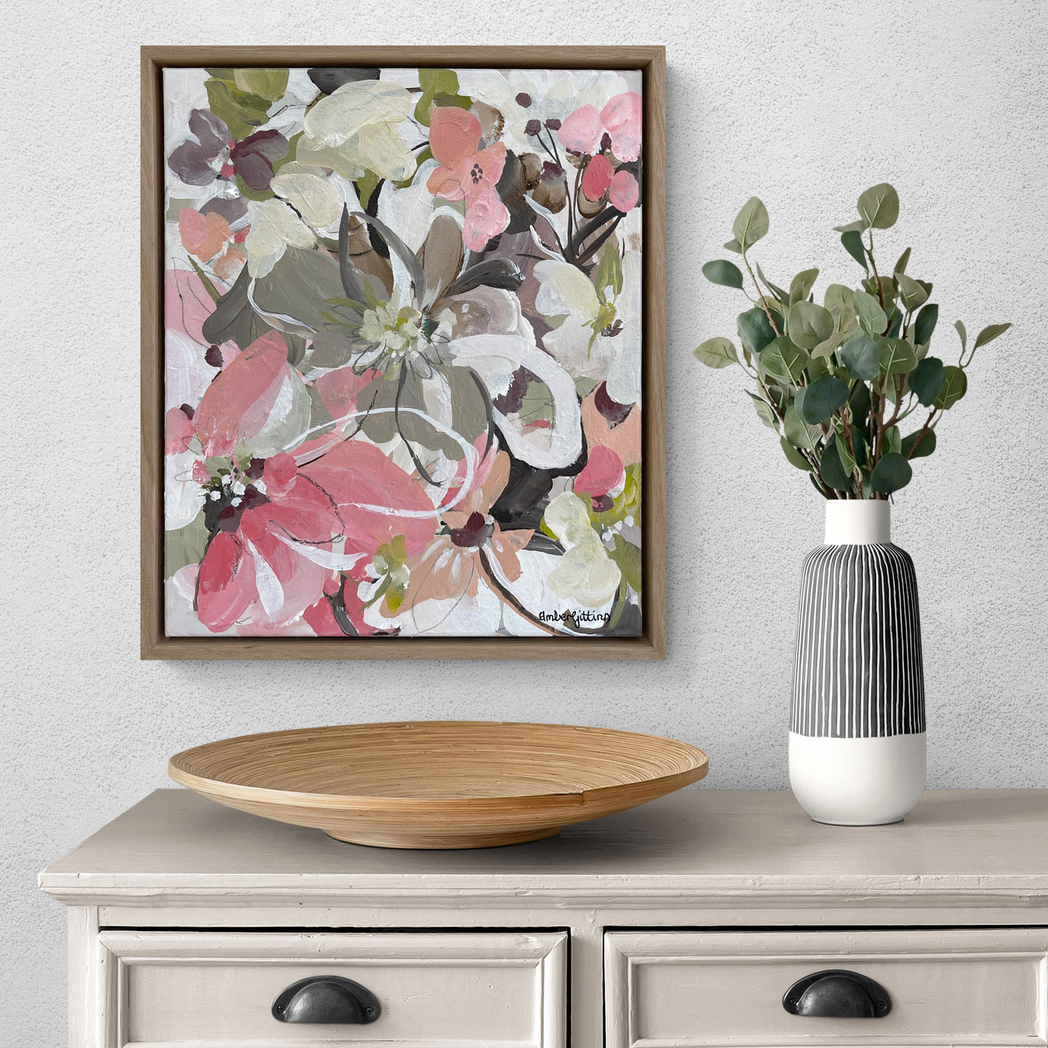 Bring nature into your home with this stunning abstract floral original painting. Inspired by the tranquil moments wandering around in a lovely colourful flower garden and admiring all the blossoming flowers. Elevate your room with a modern botanical style painting in calming moss greens and soft pastel pinks and maroons that will never go out of style.