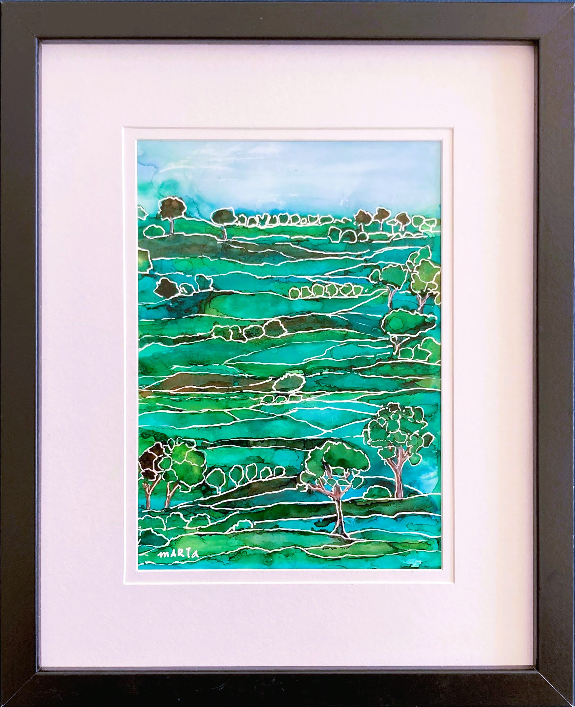 Nature’s Patchwork is a semi-abstract interpretation of a countryside. This small artwork weaves gentle hills and scattered trees into a harmonious tapestry of layered greens. Created with alcohol inks, the piece has a flowing, organic quality that evokes calm and simplicity. The fine white outlines hint at distant paddocks and tree lines, capturing the quiet picture of country life. The painting can be a peaceful focal point in your own space.