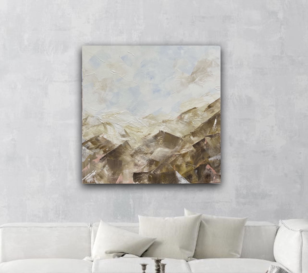 My ‘Nature’s Way Series’ is a modern take on our beautiful mountainous regions. Shades of brown, warm yellow and grey are emphasised throughout to create a neutral and statement piece. This artwork is a lovely addition to any wall.