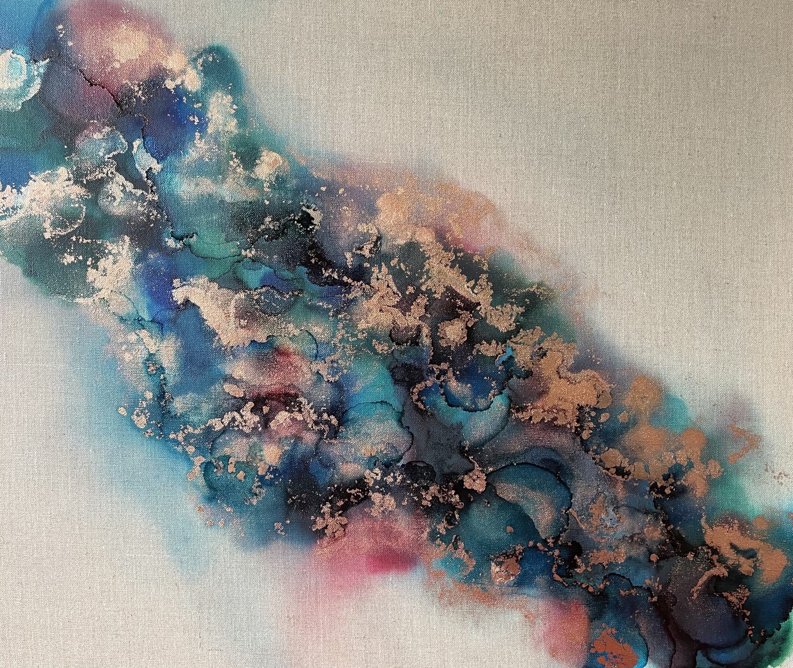 This artwork was produced with alcohol ink on pure transparent linen canvas. The neutral tone of the canvas creates a subtle harmony with the mix of cool blue and green hues. The addition of an earthy sangria and copper adds contrast and interest in the work as well as contributing to the subtle sense of movement. I particularly enjoy the way alcohol ink spreads and layers when applied to a surface. While producing this work, I manipulated the ink through blowing air over it through a straw. The result is an aesthetically pleasing artwork that would suit any contemporary space.