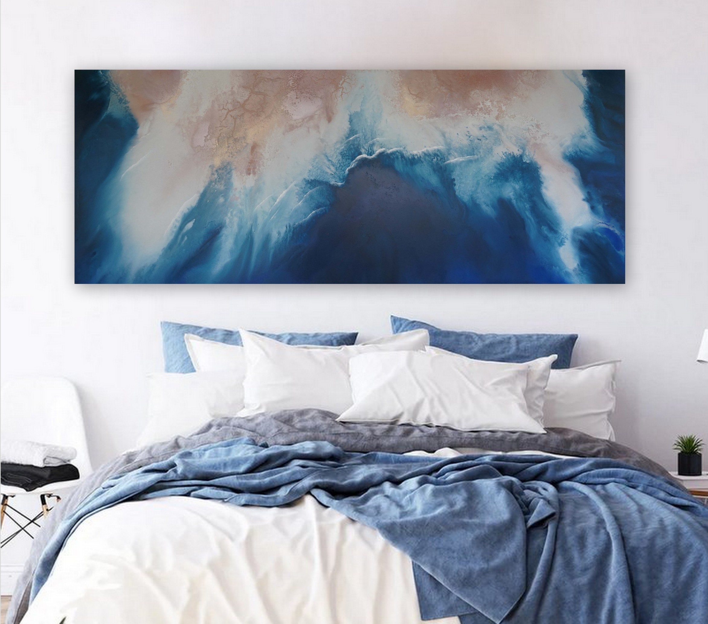 Blue Abstract Wall Art “Nebulous Depths” by Petra Meikle de Vlas – is a abstract aerial view of the ocean.