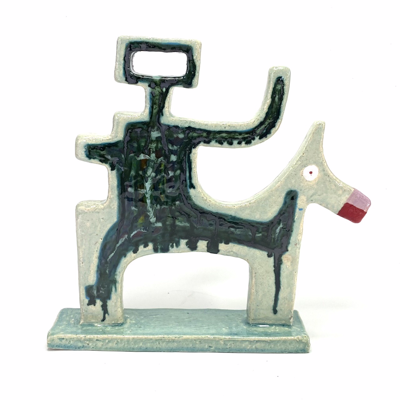 Inspired by Sydney Nolan’s Ned Kelly design. The ceramic figurine displays Ned mounted on his horse. I have used manganese oxide to create the metallic glaze effects.