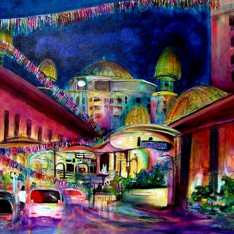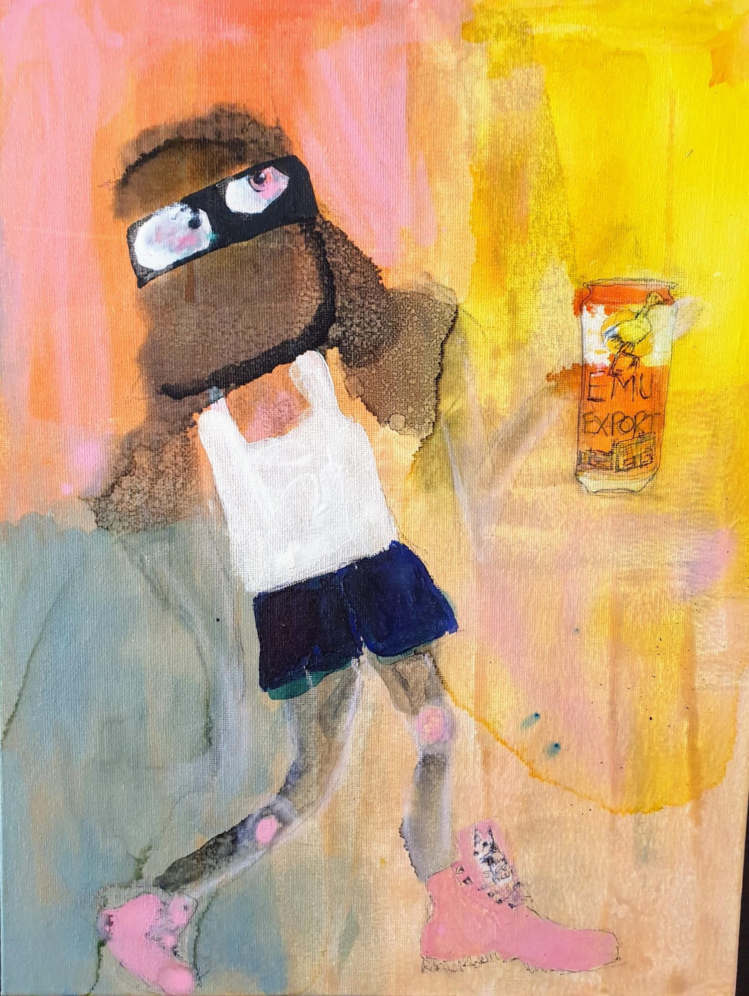 Whimsical abstract piece an image showing Ned wearing his pink breast cancer aware steel cap Blue Steel boots, having a tinny-Emu Export wearing the old aussie staple of white bonds singlet and tradie blue workshorts….