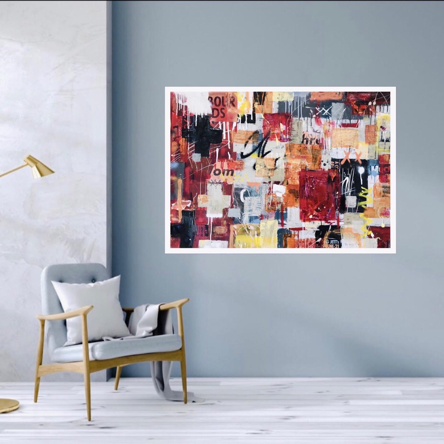 The Painting has a very textured finish created by built up layers, a visual effect mimicking the look you would see in the street where this effect is created over time on Graffiti Walls & Advertising Spaces. These imperfections are part of the overall look and feel of the finished work. Insitu examples are not to scale.
