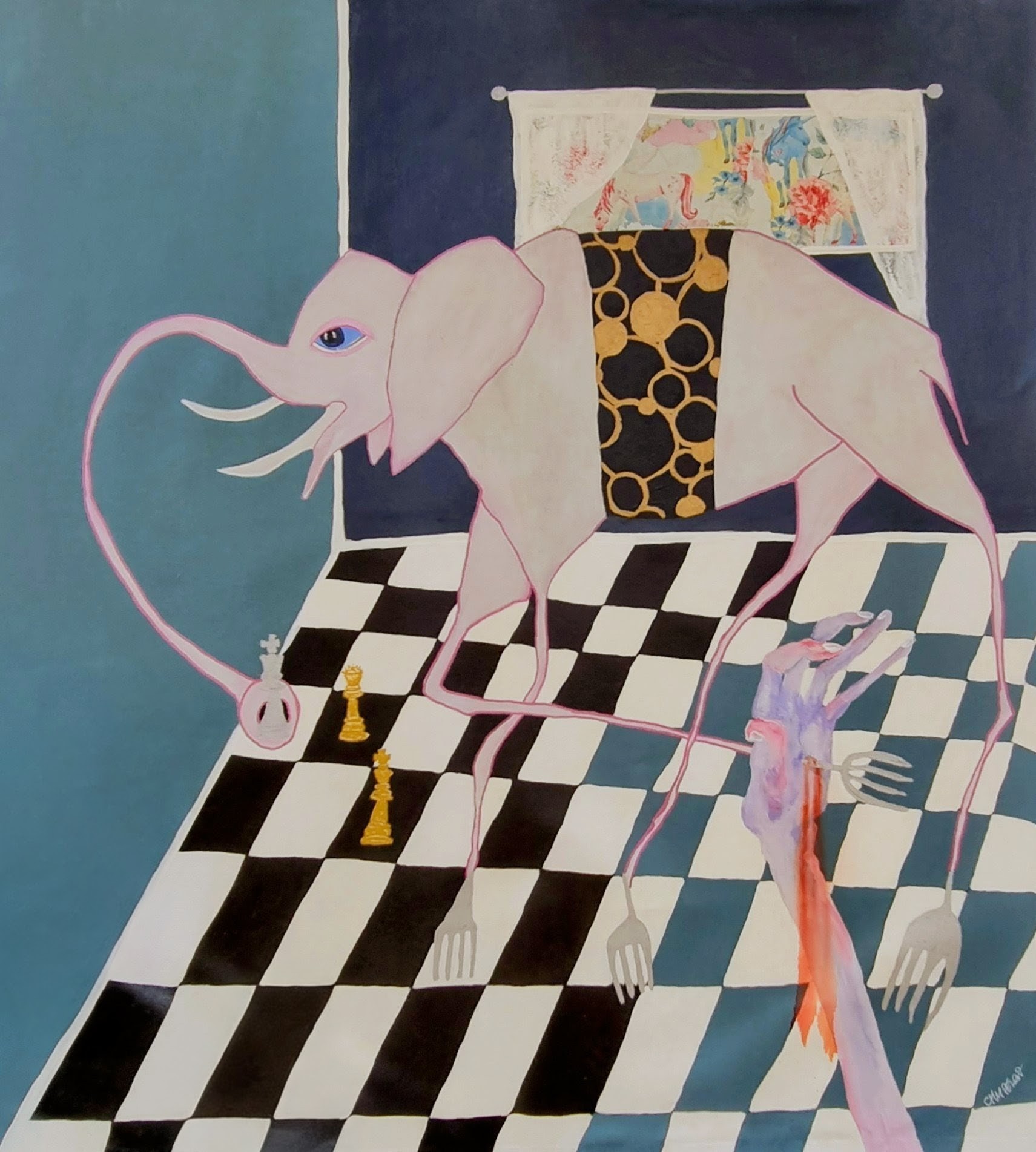 A checkmated chessboard anchors the scene, signalling a final, irreversible move—an endgame in which denial is no longer possible. Draped in coins, the elephant becomes a shimmering monument to imperial power, wealth, and the myth of “good fortune” built upon exploitation. The coins glint almost seductively, yet their weight presses heavily, reminding us that prosperity often rests on the backs of those who cannot speak.