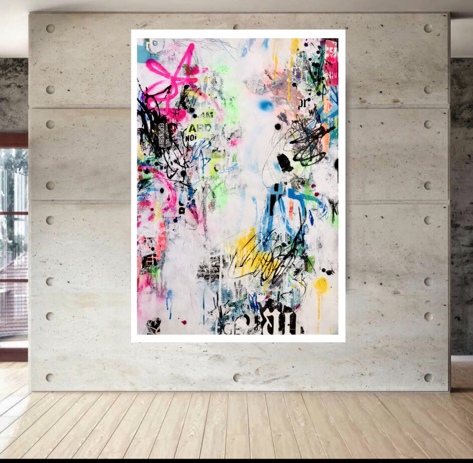 This artwork has a textured finish created by built up layers, paint splatters and torn paper, a visual effect mimicking the look you would see in the street where this effect is created over time on Graffiti Walls & Advertising Spaces. These imperfections are part of the overall look and feel of the finished work.
