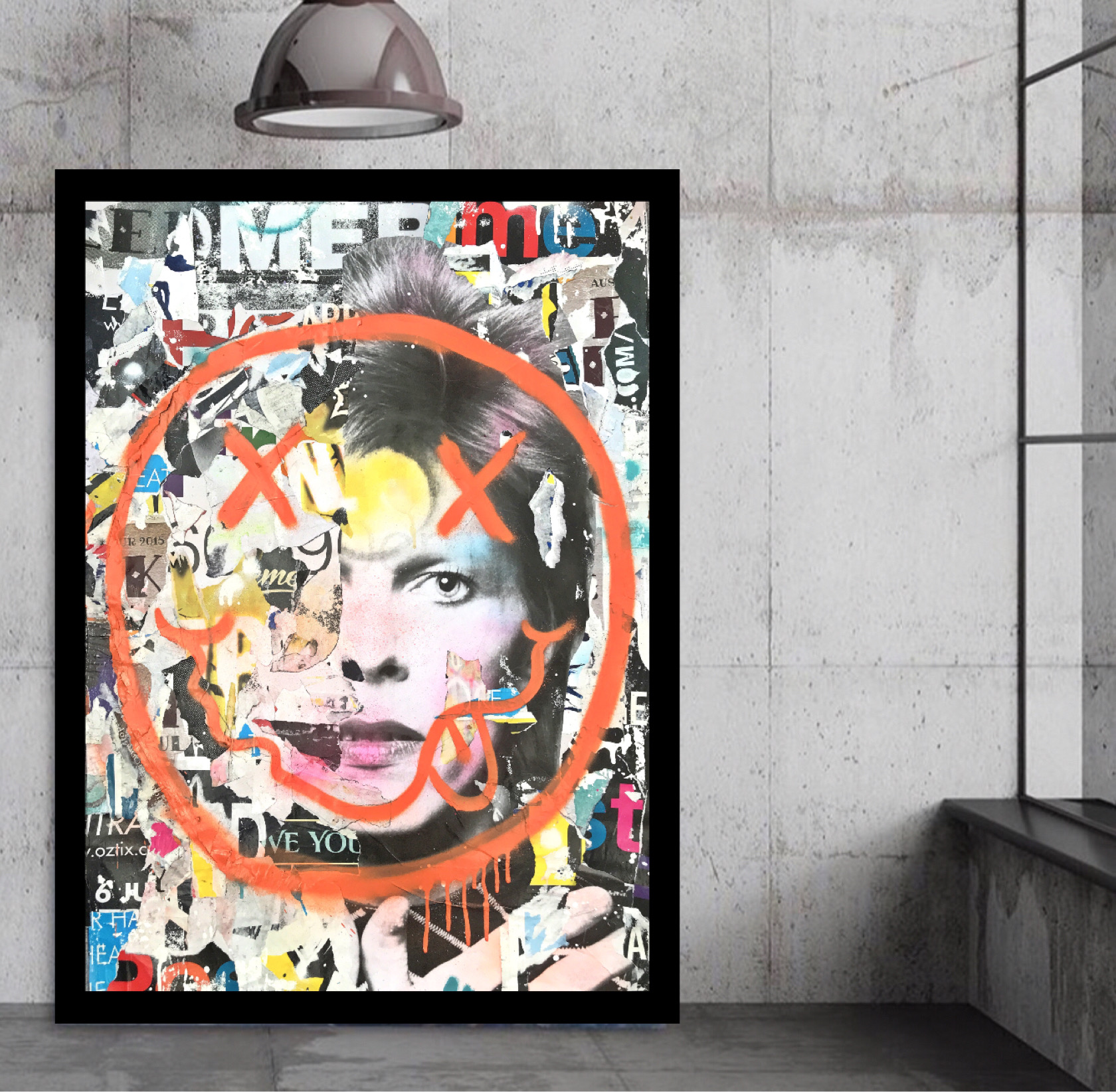 The main vintage image of Bowie was then added and then further overlaid with paint and paper to give a worn rustic appearance.