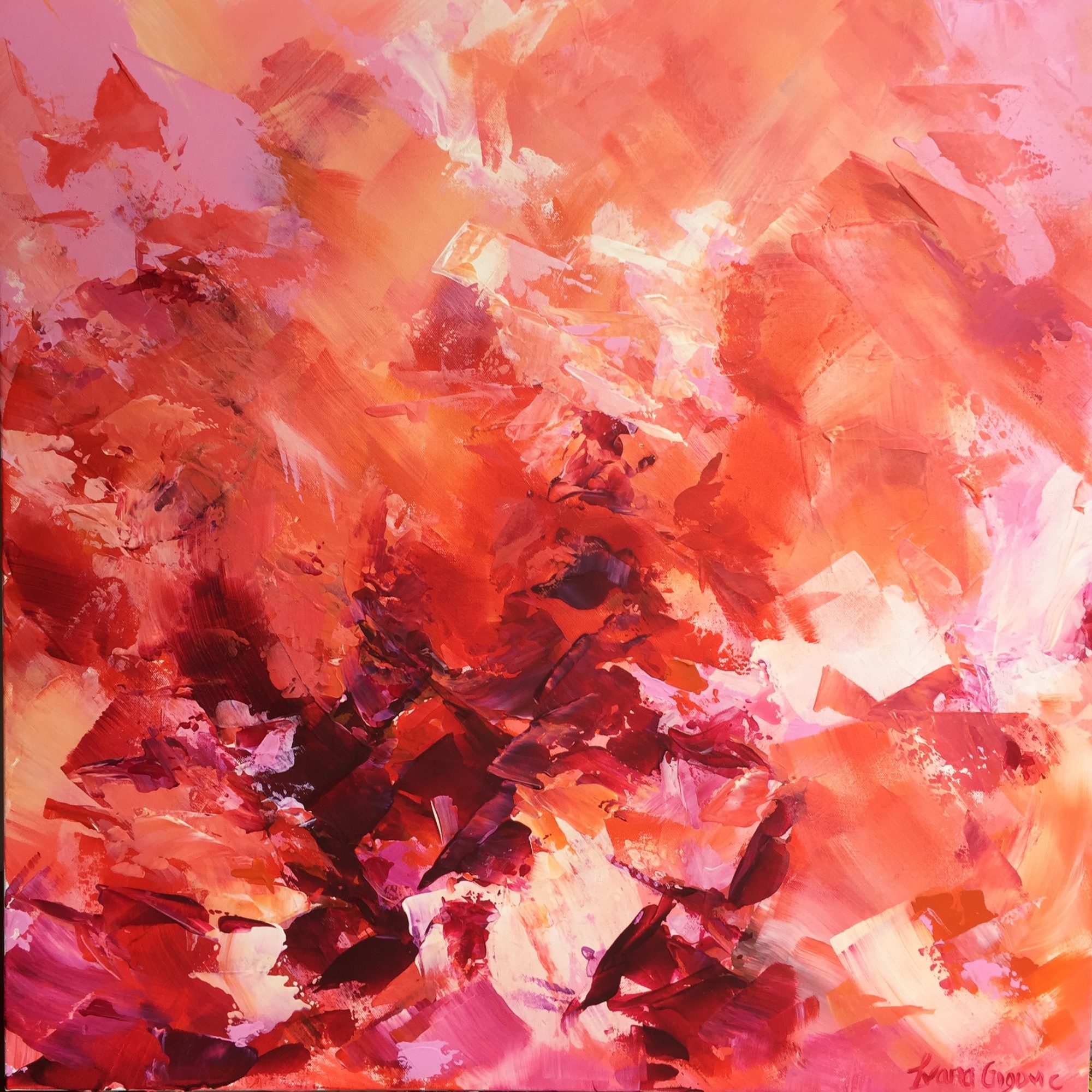 I am constantly drawn to these stunning warm colours and just couldn’t help myself as i was choosing my colour palette. I love playing adding thick layers of paint and creating a lot of detail and texture. This painting is a great statement piece and one to brighten up any wall. Â It has a strong wire at the back and is ready to hang.