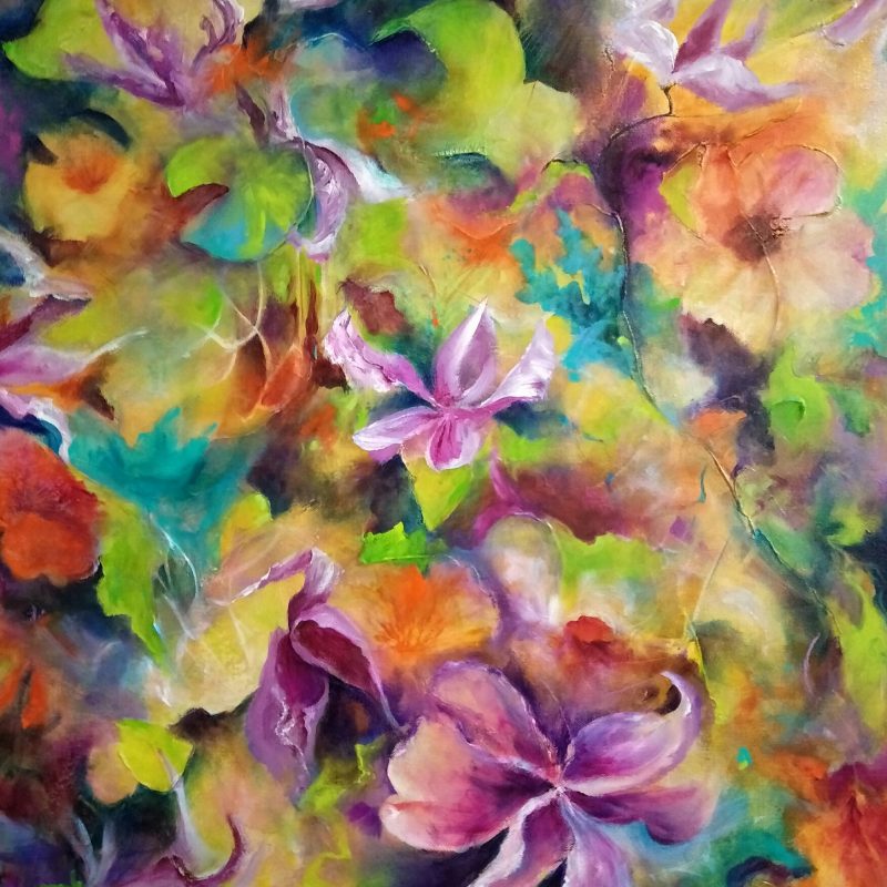 New Day dawns by Ann Needham – Extra large abstract painting of an Australian bush landscape. Most mornings I sit on my veranda and watch the colours and shapes change as the sunlight hits the trees, and the spaces between the trees. It always fills me with excitement and anticipation for what the new day may bring. Bright, bold, colourful.
