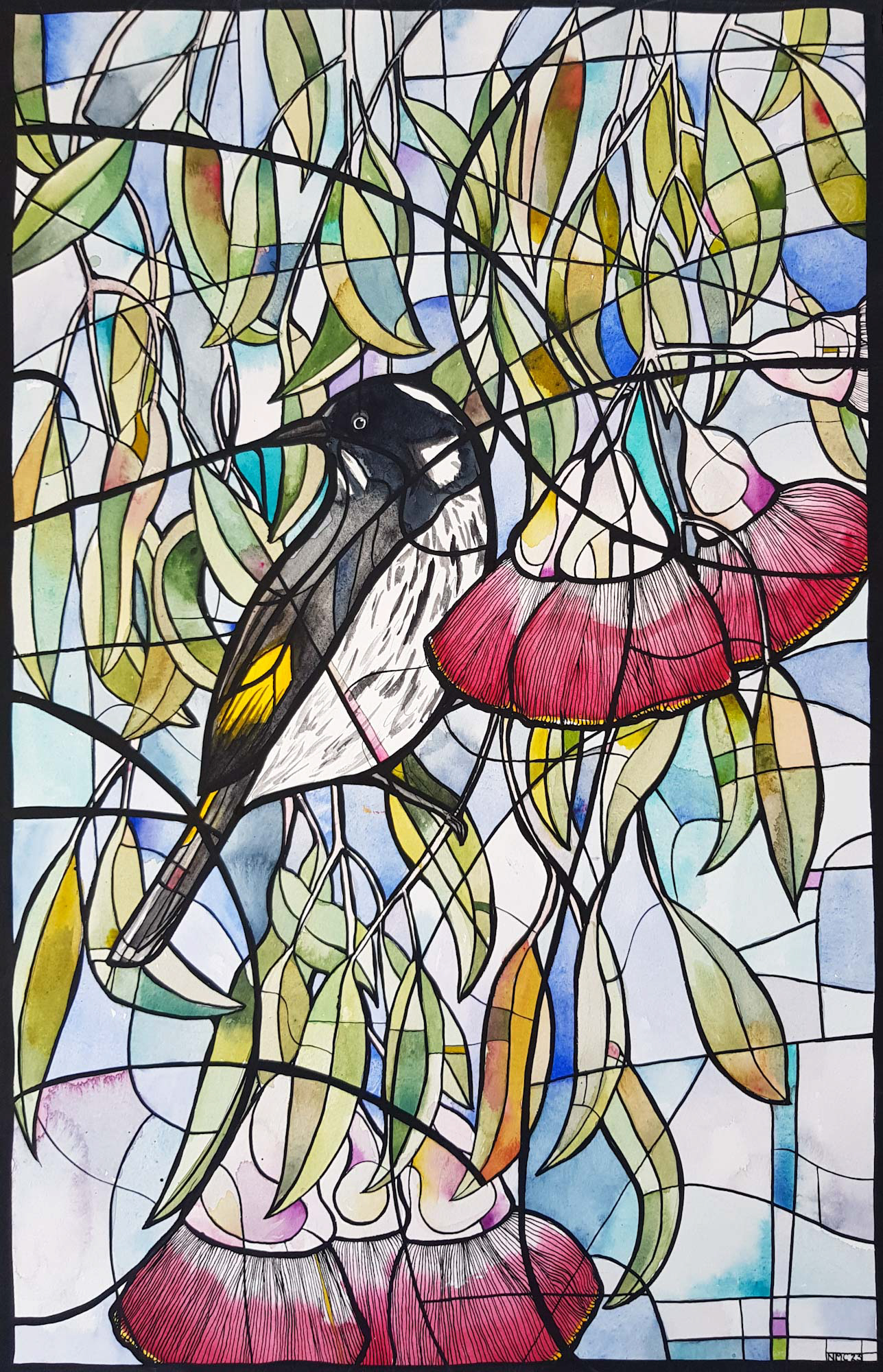 Painted with layered washes of watercolour and finished with intricate pen and ink linework which makes the painting look like stained glass.